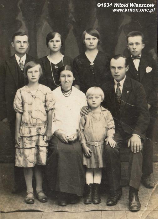 Historia mojego rodu rozmywa się w odmętach dawnych, zapomnianych lat. W drugiej połowie XVII wieku spłonął lutecki kościół, a wraz z nim parafialne archiwum, skracając boleśnie mój chłopski rodowód. Najstarszy po mieczu antecesor o którym wiem – Tomasz Wieszczek – żył na początku XIX wieku i był moim pra-pra-pra-pra-dziadkiem. Jego syn – Franciszek – urodził się 19 lipca 1837 roku i spłodził syna Wojciecha, który ożenił się z Reginą Ziobro. Urodziły się im cztery córki, a 12 stycznia 1880 roku pierwszy syn – Jan, ojciec mojego dziadka, który w 1906 roku ożenił się z Katarzyną Lech. Jednocześnie w drugiej gałęzi Wieszczków rodzili się i umierali Franciszek, Ambroży (✴ 1.11.1836) i Jan (✴ 22.07.1872). Kim byli ci ludzie, jakie szczęścia lub nieszczęścia były ich udziałem? Jaka nieskończona ilość przypadków sprawiła, że 2 maja 1907 roku na świat przyszedł Jan Wieszczek, a w 12 października 1914 roku Jadwiga Wieszczek? Tego mój ograniczony umysł nie ogarnia. Ale są to pierwsi ludzie z tej długiej listy, których dotykałem i słuchałem. Obok najstarsze (pochodzące z roku 1934) zdjęcie w mojej skromnej kronice. Na zdjęciu u góry od lewej: Staszek, Tereska, Jadwiga (moja babcia) i Andrzej. Na dole Maria (potem Joniak), Zofia (moja prababcia), Hela i Wojciech.