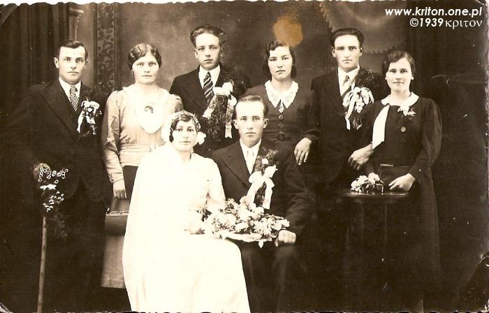 Tę fotografię wykopał Grzegorz (dziękuję). Tata twierdzi, że najprawdopodobniej zrobiono ją w 1939 roku, a przedstawia ślub Heleny i Andrzeja. Andrzej Wieszczek (✴ 19.06.1912) to brat Jadwigi – mojej babci. Na zdjęciu od lewej: Staszek (✴ 03.02.1902) – brat babci, Jadwiga (babcia), Józek Korzeniowski (sympatia Jadwigi), prawdopodobnie siostra Heli, Józef Trzeciak i Anna Wieszczek, później Trzeciakowa (✴ 25.07.1909) – siostra babci.