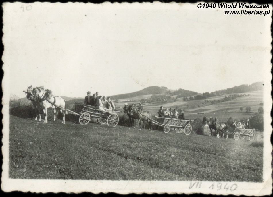 Tak w lipcu 1940 roku wyglądała Lutcza, czyli wieś, w której urodził się mój tata. W tym samym roku wykonano zdjęcie znajdujące się po prawej, a dokumentujące ślub Jana i Jadwigi. Tak się śmiesznie złożyło, że oboje przed ślubem nosili to samo nazwisko. Nie ma w tym niczego dziwnego, we wsi żyło bardzo dużo Wieszczków, Gołdów, Trzeciaków, Lechów... No ale czasem można się przez to pogubić.