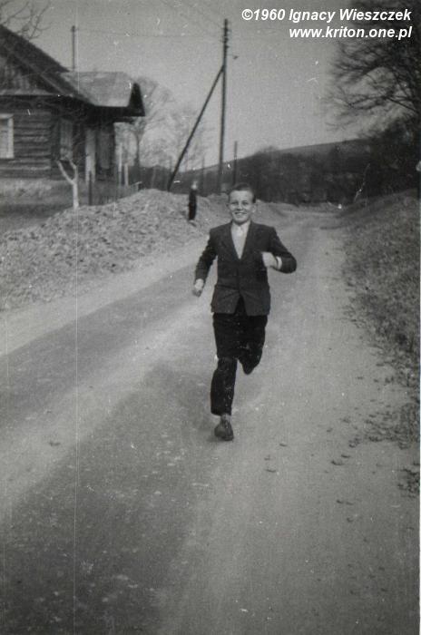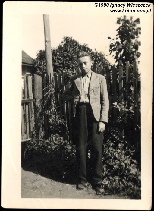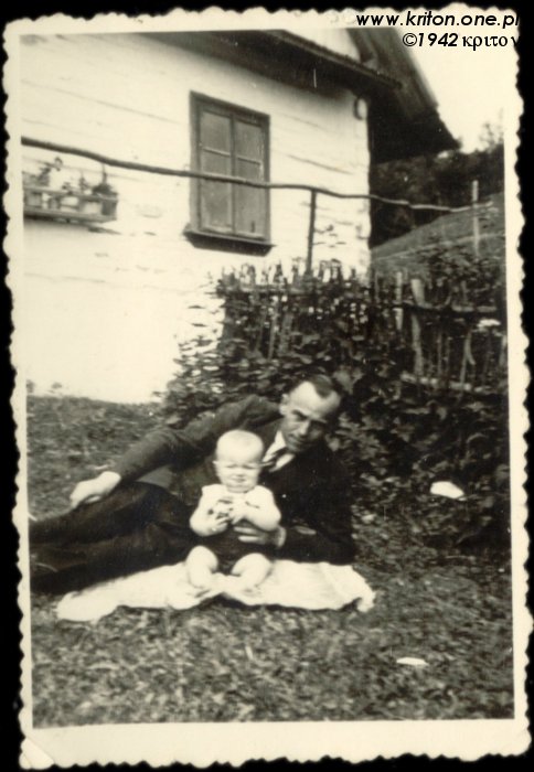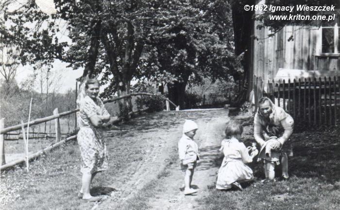 A to już mój tatuś – Ignacy Wieszczek (✴ 06.07.1941) – przed swoim rodzinnym domem w roku 1942. Mniej więcej wtedy miała miejsce pewna zabawna historia. Tata podobno chodzić jeszcze nie umiał, ale najwyraźniej umiał siedzieć, bo został posadzony w oknie z izby na ogródek. Babcia Jadwiga zagadała się ponoć z jego nianią. Z zajmującej konwersacji wytrącił je dopiero krzyk małego Ignasia, który zaciekawiony zapachami z okna wypadł. Na szczęście prosto w kwiaty, więc nic mu się złego nie stało.