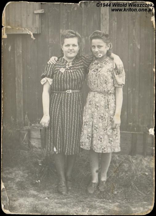 Na chwilę opuszczamy rodzinne strony mojego taty. Po prawej Filomena Skocz (✴ 6.11.1924) sama oraz z koleżanką. To drugie zdjęcie zrobiono w 1944 roku w obozie pracy w Niemczech (zwróćcie proszę uwagę na małą literkę „P” przypiętą do ubrania). Rok później, jeszcze w Niemczech, wyszła za Bolesława Boryckiego (✴ 26.10.1922), a po wojnie razem osiedlili się na ziemiach odzyskanych w Śliwicach.