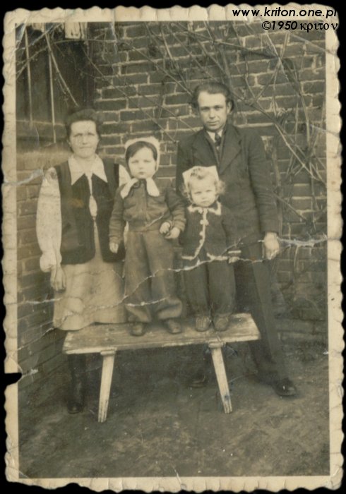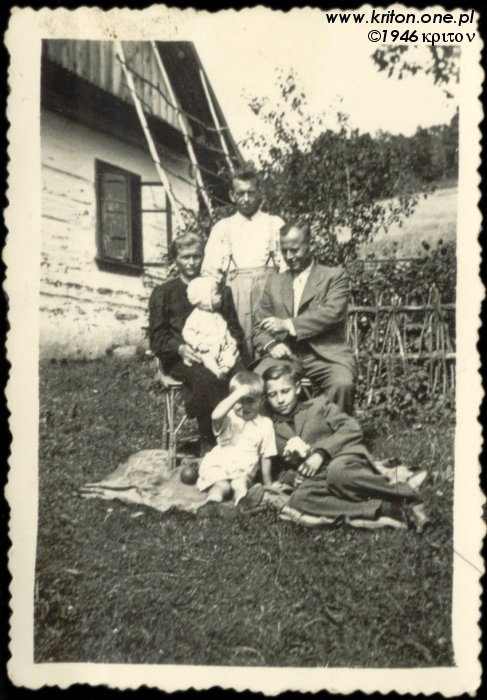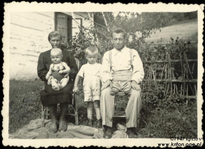 Rok 1946. Z tyłu mój dziadek, na krześle siedzi babcia, trzyma na kolanach mojego stryjka – Staszka. Przed nimi na kocu 5-letni Ignacy, czyli mój tata. Po prawej zdjęcie wykonane rok później, a na nim mój tata z bratem i rodzicami przed domem.