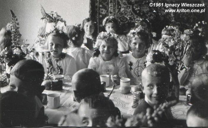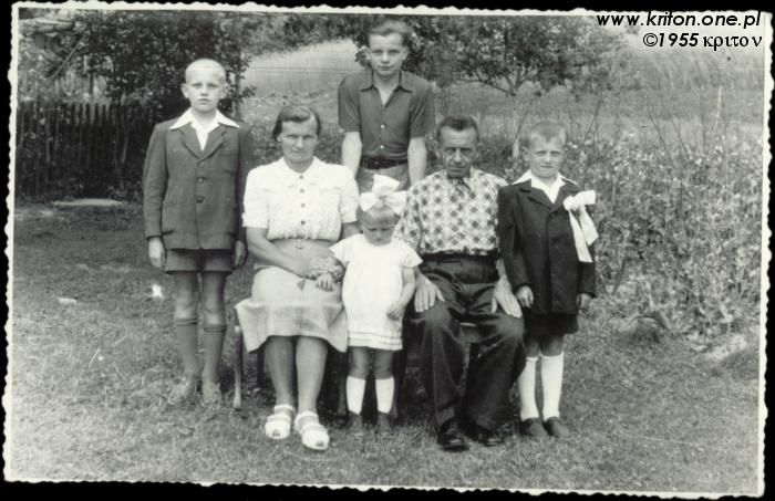 Rok 1955 – I komunia mojej mamy i w tym samym czasie, ale w innym miejscu, mój tata ze swoją rodziną. Na zdjęciu moi dziadkowie: Jadwiga i Jan, oraz ich dzieci: Ignacy, Stanisław (✴ 3.10.1945), Władysław (✴ 15.10.1948) i Teresa (✴ 03.10.1953).