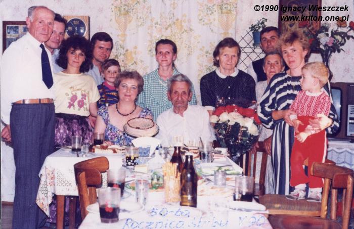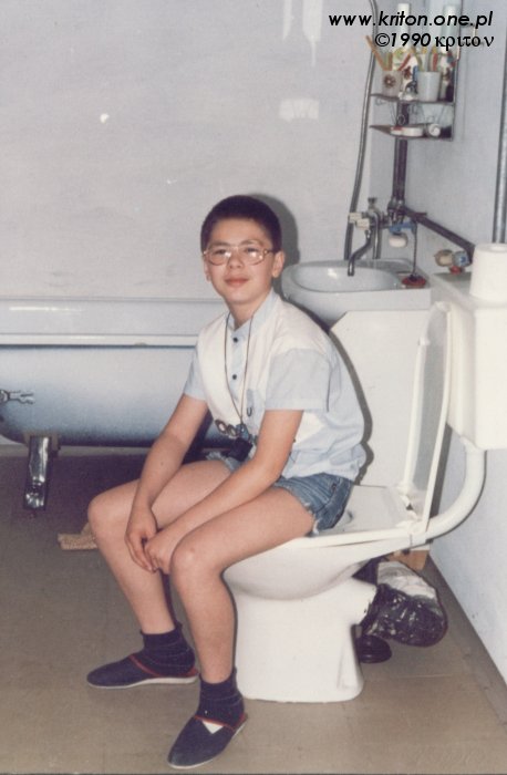 A w Lutczy w roku 1990 babcia z dziadkiem obchodzili 50. rocznicę ślubu. Jeśli dobrze pamiętam, to z tej okazji dziadek wygospodarował w kurniku trochę miejsca na łazienkę. W ramach prezentu dzieci (z pomocą swoich dzieci) własnymi siłami wybetonowały za domem szambo, poprowadzili kanalizację i wodę. W łazience były wszelkie miejskie luksusy z ciepłą wodą włącznie. Nie trzeba było już chodzić do wychodka ani kąpać się w miednicy. Jednym słowem nowoczesność w domu i zagrodzie. Tylko nie wiem, dlaczego mojemu tacie wydawało się, że zdjęcie na nowym sedesie będzie seksi.