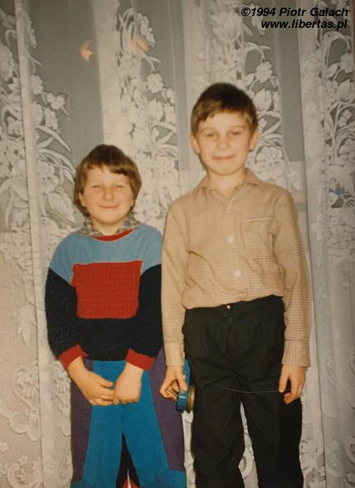 Marzec, Żory. Piotrek i Janek na pokazie mody dziecięcej Anno Domini 1994. Można powiedzieć, że był to ostatni krzyk mody pierwszej połowy lat dziewięćdziesiątych, mody zdecydowanie odchodzącej i mocno zakorzenionej jeszcze w kryzysowych latach 80. Krzyk w sumie całkiem charakterny, wesoły, powiedziałbym nawet fikuśny. Za krótkie rękawy, czy za duże buty wcale nie były wtedy oznaką ekstrawagancji! Może dlatego mamy do siebie chyba jednak trochę więcej dystansu. A przynajmniej niektórzy z nas mają. Pozdrowienia dla całej familii Gałachów i do szybkiego zobaczenia!