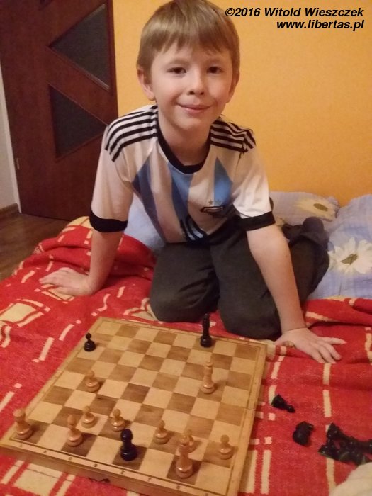 30 stycznia 2016 roku Jeremi po raz pierwszy wygrał ze mną w szachy! Zupełnie uczciwie. Nigdy się nie podłożyłem, zawsze starałem się wygrać, teraz oczywiście też. Gdy grałem jeszcze z tatą, mama często mówiła mu, żeby dał mi choć raz wygrać. Tylko jaką można mieć radość ze zwycięstwa, gdy wiadomo, że przeciwnik nam na to pozwolił? To jest zupełnie bez sensu, więc też nigdy Jeremiemu forów nie dawałem, ale tym razem chyba go troszeczkę zlekceważyłem! Wystarczyła chwila nieuwagi i jak grom z jasnego nieba – mat! Gratuluję synu!