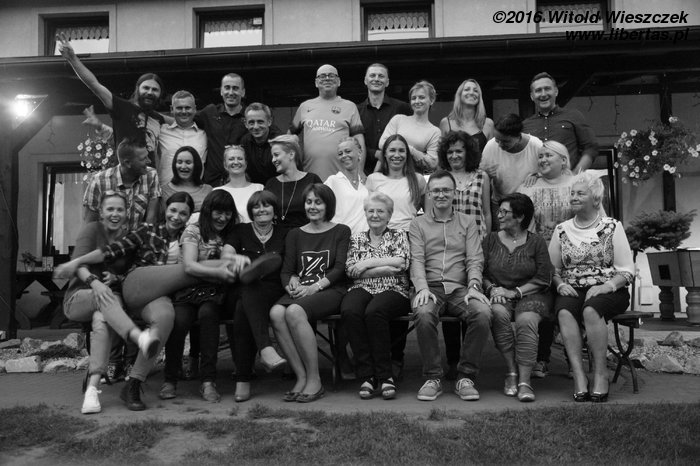 Ustawiamy się do pamiątkowej fotografii! Próbujemy w miarę możliwości odtworzyć konfigurację ze zdjęcia grupowego zrobionego na początku klasy maturalnej. Niestety nie wszystkim udało się dotrzeć, więc są braki, ale myślę, że jak na dwadzieścia lat po maturze – nie jest źle! Wynik? 21/35! A że na spotkaniu była moja ulubiona nauczycielka matematyki – pani Beata Jaroń-Wróbel – to pochwalę się, że potrafię jeszcze liczyć i było nas dokładnie 3/5, czyli równe 60% stanu oryginalnego!