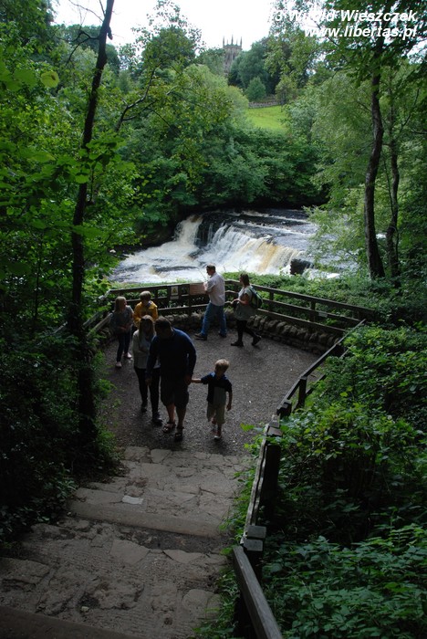 Największą atrakcją turystyczną wsi są Aysgardzkie Wodospady (Aysgarth Falls), na których w 1990 roku kręcono sceny do filmu pt. Robin Hood – Książę złodziei. Rzeka Ure pokonuje tutaj szereg skalnych stopni, a powstałe w ten sposób kaskady rozciągają się na długości niecałych dwóch kilometrów. Wodospady nie są może wysokie i spektakularne, ale nadają miejscu specyficzny urok. Wiele osób przychodzi tu po prostu posiedzieć na kocu i odpocząć przy relaksującym szumie wody. Kaskady grupują się w trzech miejscach, do których można krótkim spacerem dojść. Najwięcej piknikowiczów widziałem chyba przy górnych wodospadach (The Upper Falls), gdzie brzegi szeroko pokrywała miękka trawa idealna do rozłożenia kocyka. Środkowe wodospady (Middle Falls) można obejrzeć ze specjalnej platformy widokowej, a położone najniżej (The Lower Falls) zobaczymy, spacerując zerodowanym wapiennym brzegiem. Z bliska widać, że woda wypłukująca skałę ma lekko rdzawy kolor. Więcej o tym bardzo sympatycznym miejscu oczywiście znajdzie w libertasowym przewodniku: