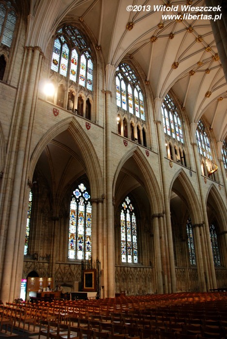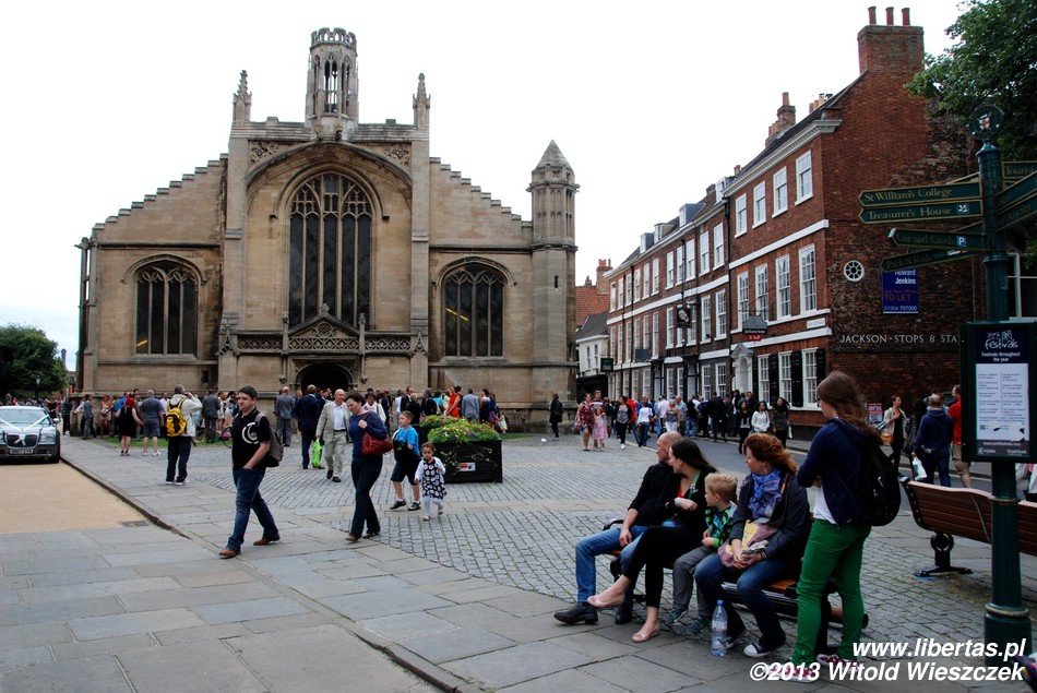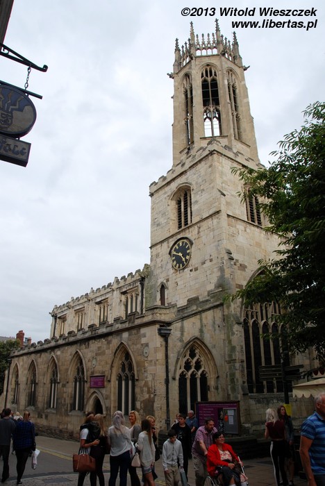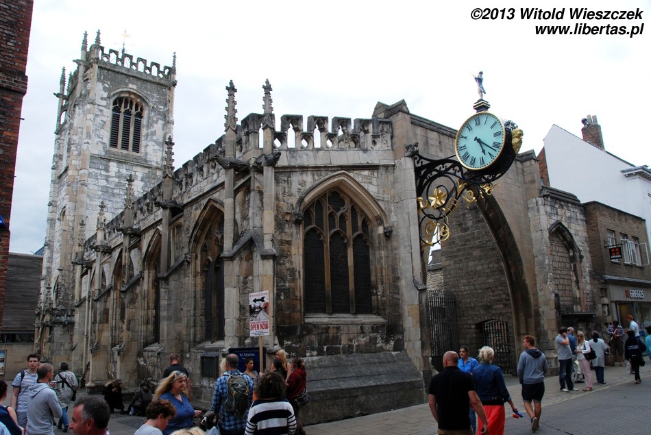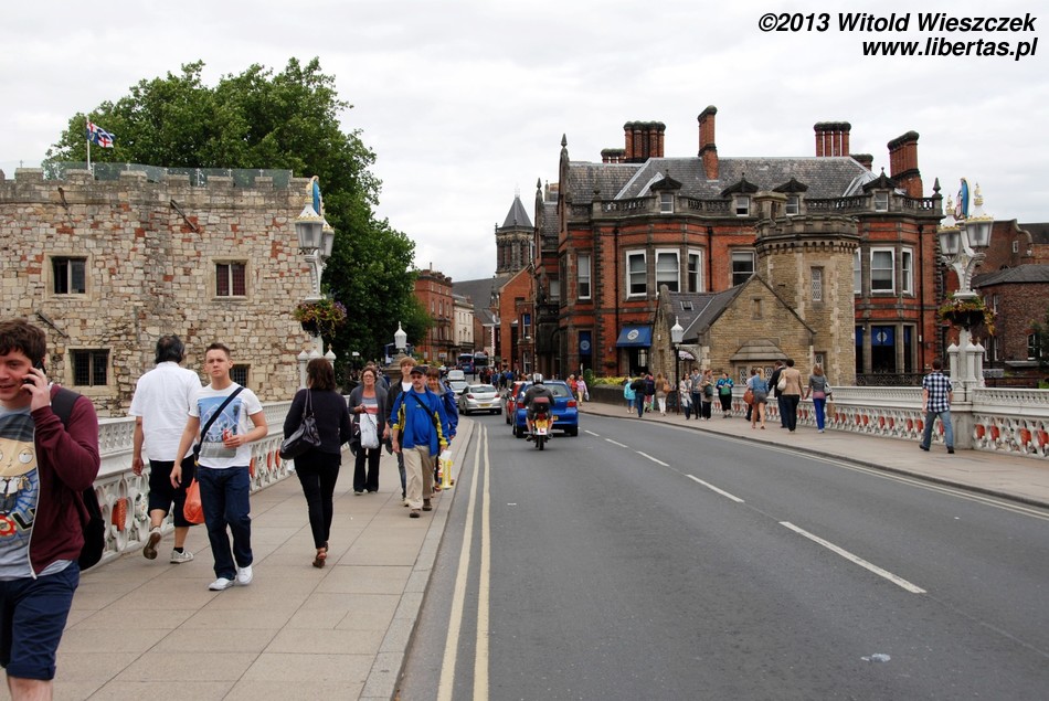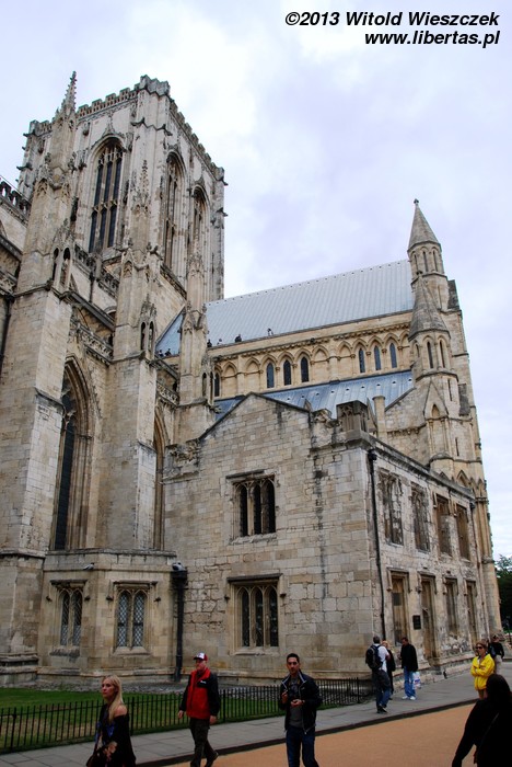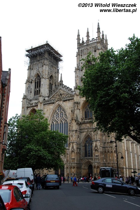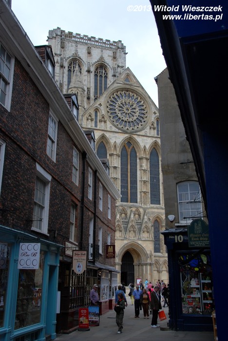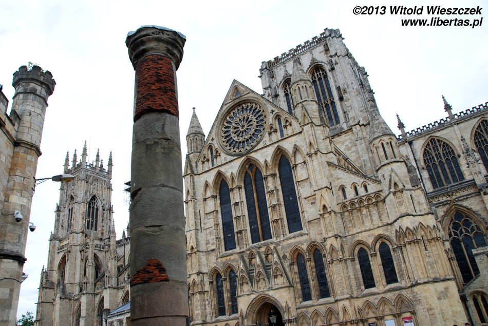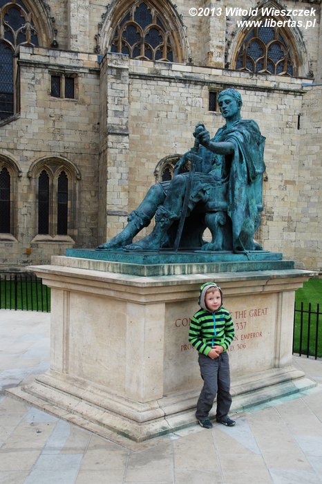 Obejrzeliśmy również York Minster, drugą co do wielkości gotycką katedrę w północnej Europie. Ma ona około 158 metrów długości, jej chór mierzony wewnątrz około 30 metrów wysokości, a centralna wieża 61 metrów. Wielkie Wschodnie Okno katedry jest największym witrażem na świecie! Jest także najstarszym na wyspach dziełem sztuki, którego autor jest znany z imienia i nazwiska. Witraż został wykonany przez Jana Thorntona z Coventry. Niestety zwiedzanie wnętrza jest płatne (słono), więc zadowoliłem się podziwianiem katedry z zewnątrz i nieśmiałym rzutem oka do środka. Tymczasem na mnie patrzył posąg Konstantyna Wielkiego. Szczerze mówiąc, nie miałem pojęcia, że został on obwołany cesarzem właśnie w Jorku. Podróże kształcą! A więcej o tym starożytnym mieście w libertasowym przewodniku: