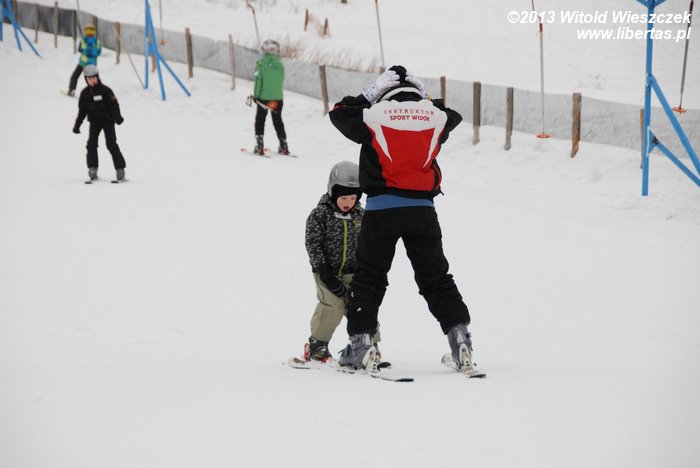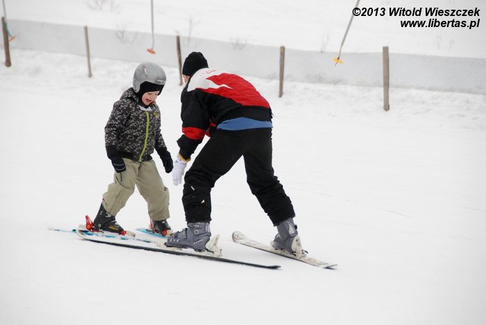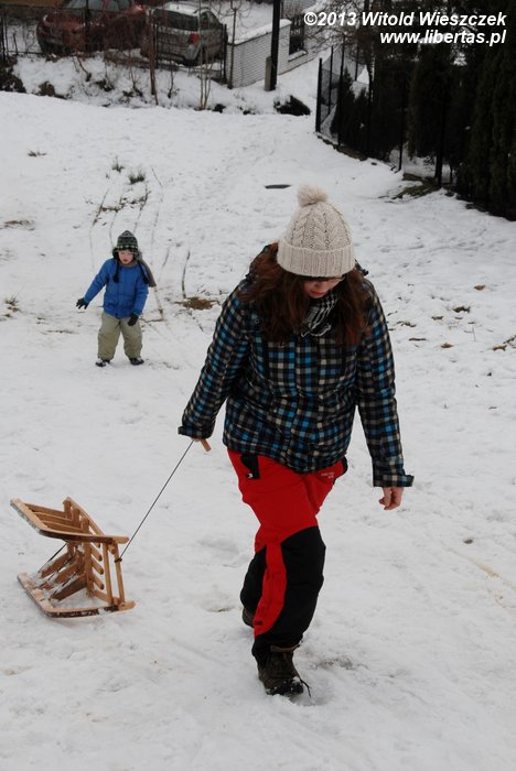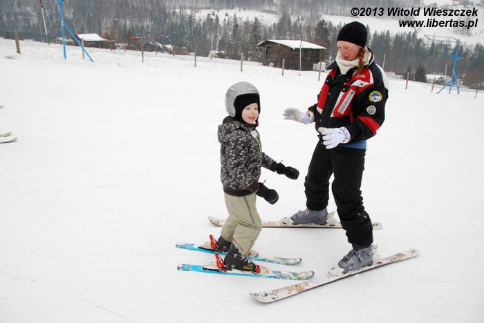 Mówiąc krótko, po raz kolejny wybraliśmy się do Wilkowic, gdzie na przydomowej górce można śmigać na sankach z prędkością światła i skąd o rzut kamieniem jest Szczyrk. Z domu nawet Skrzyczne widać, które codziennie zresztą nas do siebie przyzywa. W związku z tym postanawiamy sobie łikend przedłużyć i w poniedziałek wybieramy się na narty. Jeremi najpierw trenuje pod okiem instruktorki, a potem już pod moim. Po wykorzystaniu całego karnetu na wyciągu talerzykowym potrafi zjechać slalomem i nawet całkiem nieźle mu to wychodzi, co zresztą udaje mi się uchwycić na filmie, zaraz przed tym, jak pada bateria. Zupełnie jak na reklamie!