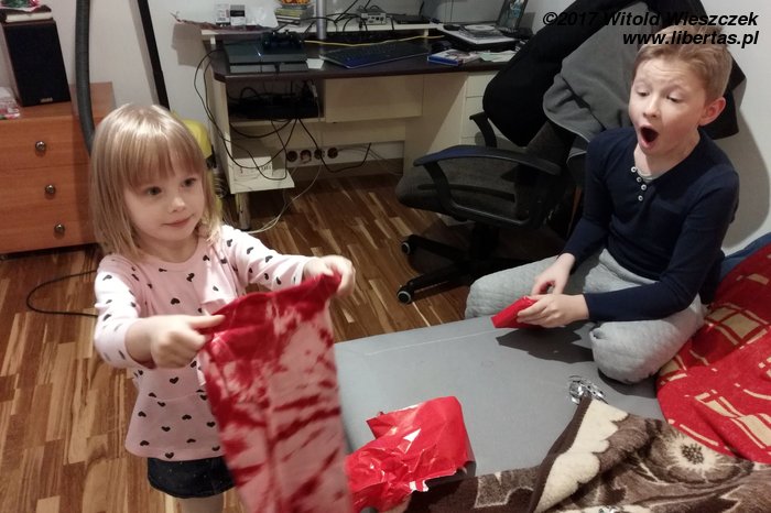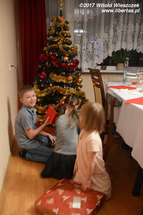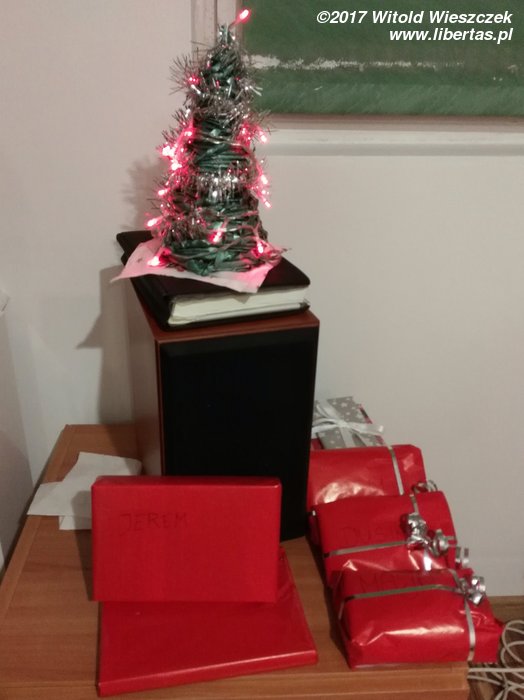 Skoro święta, to prezenty, a jeśli prezenty, to musi być i choinka, bo przecież gdzieś je trzeba zostawić! Na wysokości zadania staje jak zwykle Kasia i przynosi nie tylko choinkę, ale nawet oświetlenie! Można powiedzieć, że są to najbogatsze święta, jakie pamiętam, bo jeszcze nigdy prezenty nie zajmowały więcej miejsca niż świąteczne drzewko!