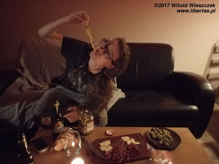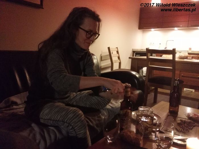 Gdy tylko Kasia dowiedziała się, że bujam się po Kazimierzu z jakąś piękną kobietą, to natychmiast mi przyjemności pozazdrościła i przyjechała. Tak się zabawnie złożyło, że akurat wypadły moje imieniny, więc w ramach prezentu przywiozła mi „Atak Chmielu”! Każdy pretekst jest dobry, żeby się napić dobrego piwa. Zdrowie naszej uroczej gospodyni!