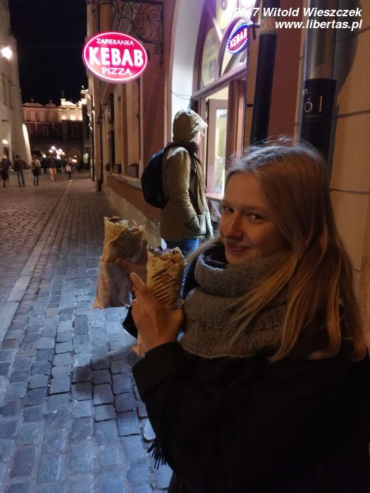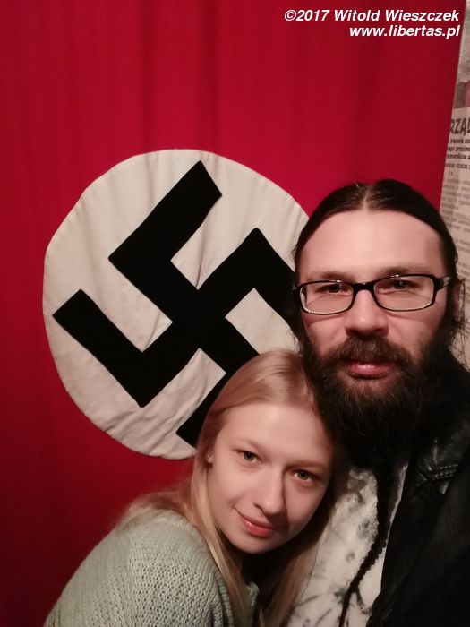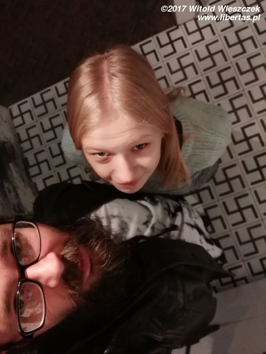 To był bardzo udany łikend, nie tylko towarzysko-gastronomicznie, ale również kulturalnie, bo dzięki koneksjom zupełnie za darmo i bez kolejki zwiedziliśmy jeszcze muzeum w Fabryce Schindlera i nie tylko. W muzeum było bardzo dużo swastyk, czyli indyjskiego symbolu szczęścia. Hitlerowi swastyka szczęścia nie przyniosła, ale i tak w całej Europie wszystkim kojarzy się tylko z jednym. I tak razem z nazistami wielotysiącletnia tradycja tego symbolu (najstarsze wizerunki mają po 10000 lat!) wylądowała na cenzurowanym. Słowiańska wersja swastyki, czyli Swarga jest sympatyczniejsza, ale swastyki też bym nie demonizował. To nie jest jej wina, że się spodobała nazistom. Bardzo się cieszymy, że przekrzywioną wersję w białym kółku na czerwonym tle oglądamy już tylko w muzeum, więc z tej radości zrobiliśmy sobie na tym tle zdjęcie, i co? Według niektórych, ja, stary hipis okazałem się... faszystą! Jacy ludzie potrafią być ograniczeni umysłowo, to jest aż przykre. Na wszelki wypadek, zamieszczam też zdjęcie, na którym demonstrujemy pogardę dla hitlerowców, depcząc swastykową podłogę. Howgh!