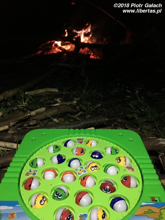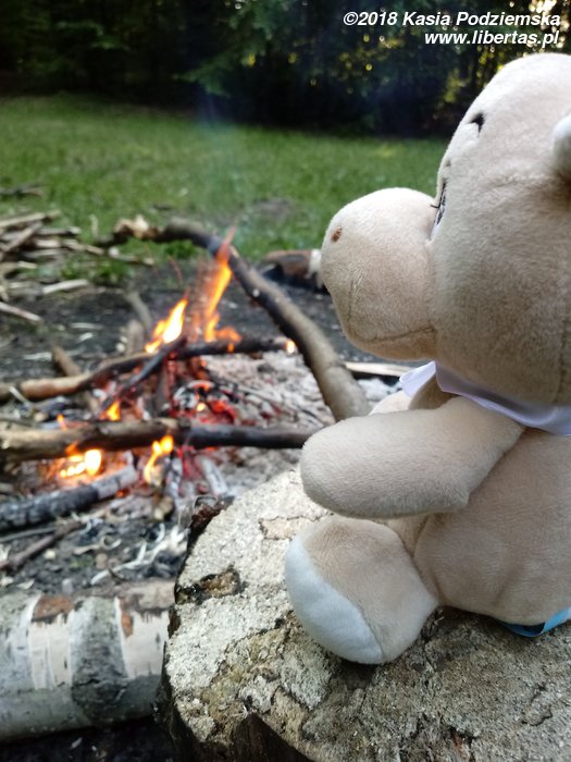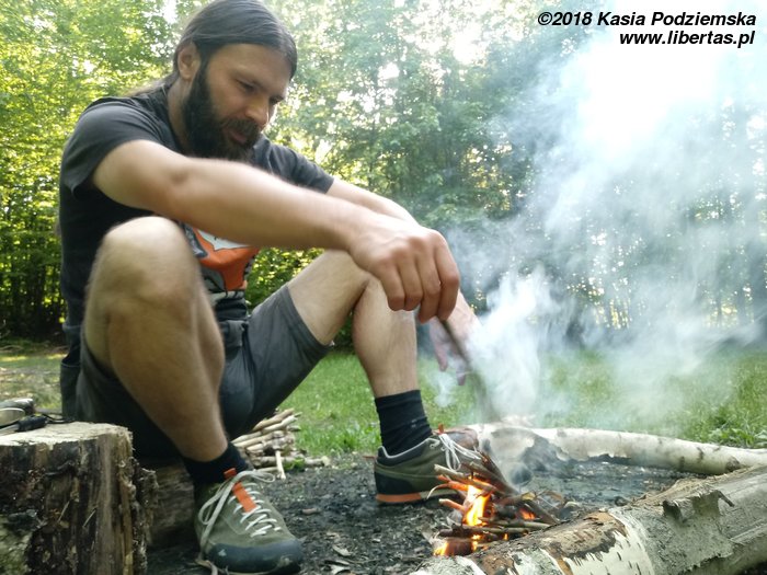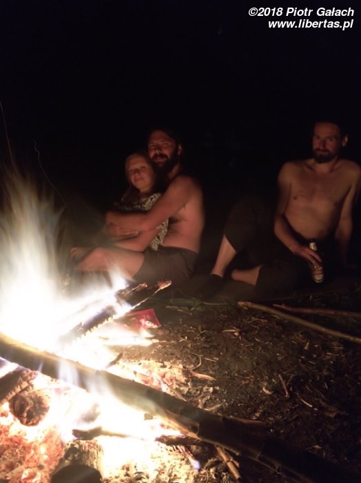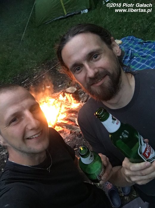 Po południu dojechać do nas mają Piotrek z Alem, więc z odpowiednim wyprzedzeniem zbieramy chrust i ostrzymy patyki na kiełbaskę. Chłopaki się spóźniają, więc z nudów rozpalam ogień krzesiwem, a nieskromnie dodam, że pierwszy raz udało mi się to zrobić sprawnie! Spóźniają się, bo postanowili przyjechać do nas limuzyną, a konkretnie wypasionym mercem pożyczonym od Jasia (pozdrawiamy). Samochód jest tak wygodny, że Piotrek, zamiast łamać przepisy jak normalny człowiek i dojechać w pół godziny, wlecze się autostradą 50 km/h. No ale są jak zwykle uśmiechnięci i dobrze wyposażeni w 20 piw marki Perła. Wygląda na to, że jedynie niepełnoletnia Rózia pozostanie dzisiaj trzeźwa.