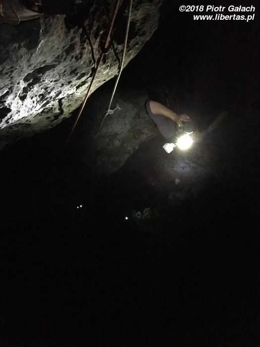 Po szóstym piwie nie było już żadnej erekcji, co ograniczało nasze możliwości bojowe, postanowiliśmy więc, że to odpowiedni czas, żeby się wspinać. Ze zdumieniem odkryliśmy, że na Knurze jakiś kretyn założył chyba poręczówki i to nie jest żart. Lina zaczynała się bodajże na Pięknym Alvarezie, następnie biegła w poprzek przez wszystkie drogi i spadała z drugiej strony skały, przy czym w każdy ring był wpięty ekspres, a na nim zawiązana wyblinka. Zupełnie jakby ktoś zarezerwował sobie całą skałę i jednocześnie zabezpieczył się przed zrzuceniem liny.