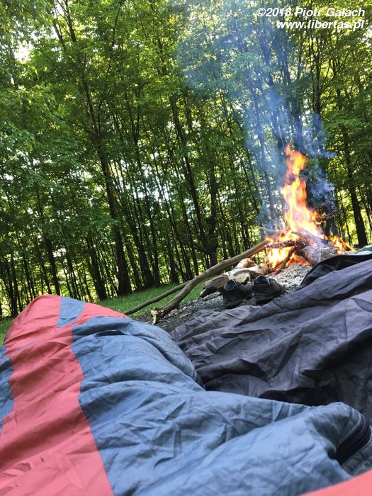 Wróciwszy do ogniska, chłopcy stwierdzają, że nie są w stanie już rozbić namiotu, więc żeby spać w komfortowych warunkach, trzeba podtrzymać ogień. W tym celu wybierają się uzupełnić paliwo, gardzą jednak wilgotnym chrustem leżącym pod nogami, a wyszukują uschnięte gałęzie nad swoimi głowami, wchodzą na drzewa, a następnie próbują sprowadzić takie suchutkie czyściutkie konary do parteru. Piotrek ambitnie upatrzył sobie dość gruby egzemplarz, który nie chciał z nim jednak współpracować. Wchodził więc coraz wyżej by nadać ciosowi odpowiedni impet, jednocześnie utrzymywał równowagę, trzymając się jakiejś wyższej gałązki. W końcu mu się udało i chrust odpadł, a zaraz potem on sam, z jakimś małym patyczkiem w ręku. Jak to już ustaliliśmy, podczas wspinania najważniejsze jest bezpieczeństwo.