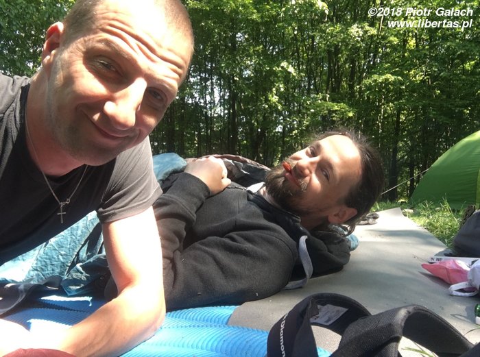 Jesteśmy zwolennikami wyjazdów bladym świtem i zdarzało nam się już wstawać w środku nocy, by jeszcze przed pierwszym promieniem słońca ruszyć na szlak. Krótko mówiąc, nie jesteśmy leniami, ale różne wypadki chodzą po ludziach i tym razem wyjechaliśmy z Tychów dopiero po 10. Jak mówi ludowa mądrość, kto późno przychodzi, ten sam sobie szkodzi i rzeczywiście, pod skałami jak w mordę strzelił, wisi pół Opola, a przynajmniej jakiegoś tamtejszego wysokogórskiego klubu, hej. Napotkany dżentelmen wita nas jak w swoim dworzyszcze, informując, że mają tu klubową imprezę i możemy spodziewać się 70 osób, ale oczywiście (obmacując wzrokiem wdzięki Kasi) zaprasza nas na imprezę. Uczucia mamy mieszane, ale ponieważ nasza ulubiona polanka stoi pusta, postanawiamy rozbić namiot i poudawać, że potrafimy się wspinać na jedynej nieoblepionej wspinaczami skale. Bez rezultatów.