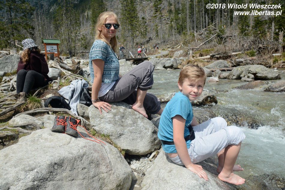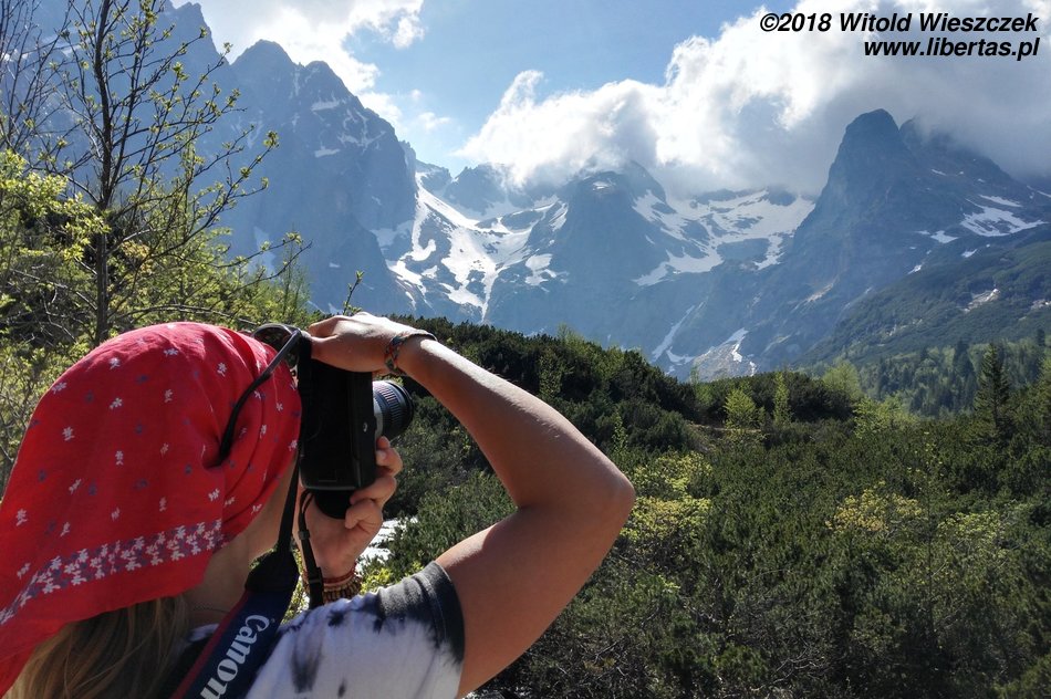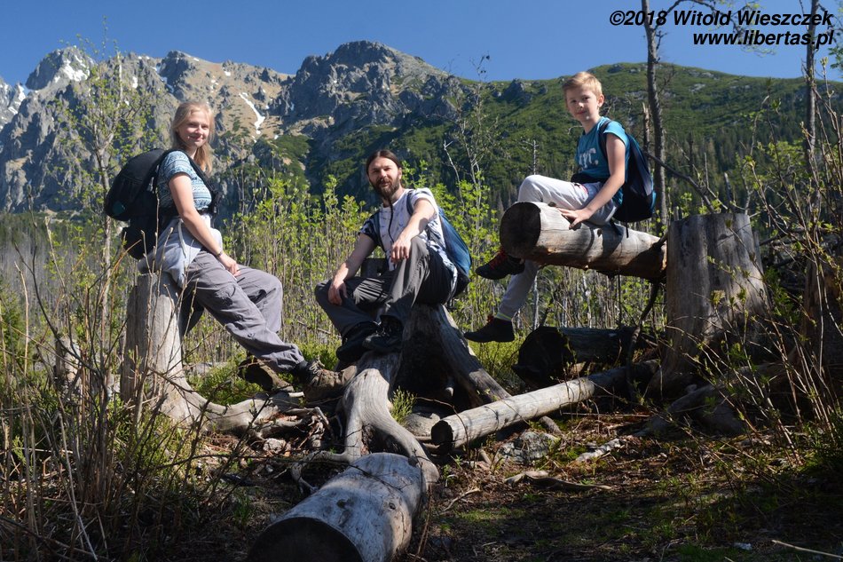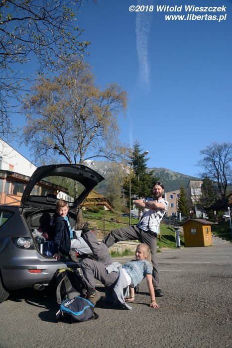 Żeby w pełni każdy dzień wykorzystać, wyruszamy w nocy i już o siódmej jesteśmy w Starym Smokowcu, gdzie rozpoczynamy naszą pierwszą, rozgrzewkową wycieczkę. Jak mówi stare chińskie przysłowie, ktoś musi pracować, żeby odpoczywać mógł ktoś inny. W tym wypadku arbajtują nasi bracia Słowacy, więc nie dość, że możemy odpoczywać, to jeszcze pomimo pięknej pogody szlak jest praktycznie pusty! Wszelkie, zupełnie niezanieczyszczone ludźmi, okoliczności przyrody czekają właśnie na nas! Cała nasza majówkowa ekipa w składzie: Kasia, Patrycja, Jerem i ja uśmiechnięta i zadowolona dociera do celu, czyli Chaty Zamkowskiego.