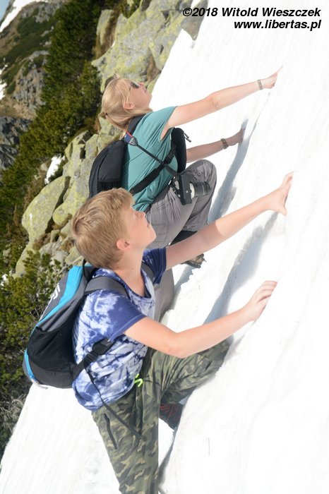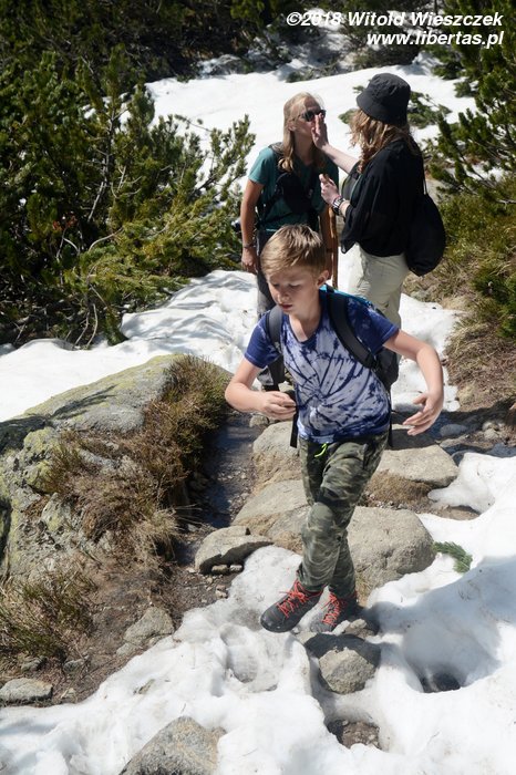 Początkowo idziemy razem, ale rodzice Kasi wracają już dzisiaj do domu, więc nie chcą schodzić za późno, nas z kolei nic nie goni, więc idziemy spokojnym tempem, zatrzymując się często na zdjęcia i podziwiając widoki. Niestety gdzieś w połowie drogi do schroniska pod Soliskiem Jerem znowu zobaczył trójkąt i wyrżnął jak długi, wybijając sobie przy okazji palec. To jego nowe hobby zaczyna być niebezpieczne! Boli go mocno, ale jest dzielny, postanawiamy więc iść do schroniska, a najwyżej stamtąd zjechać kolejką. Szlak robi się coraz bardziej stromy, pojawia się też śnieg, ale dla Jerema to nie przeszkody, tylko wręcz dodatkowa atrakcja. Gdy więc doszliśmy do schroniska, ku mojemu zaskoczeniu Jerem mówi, że on nie chce na dół, tylko na szczyt!