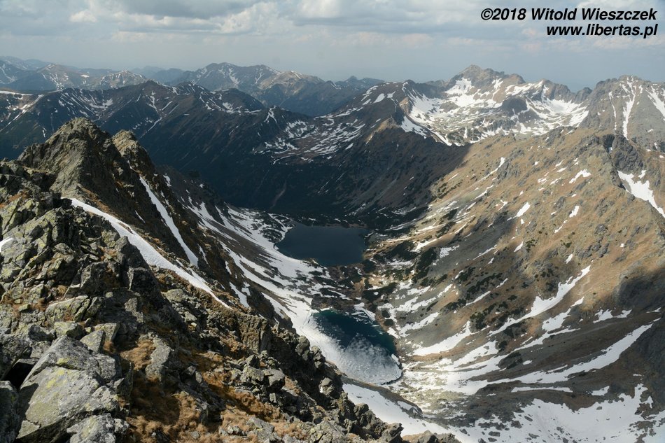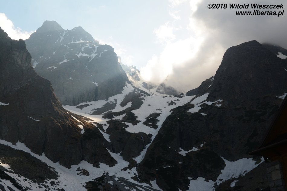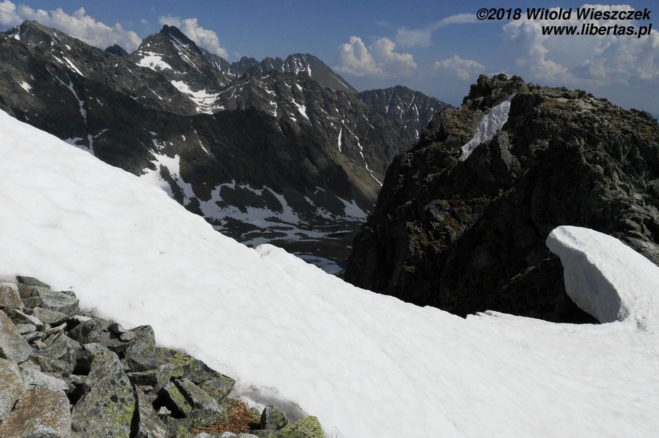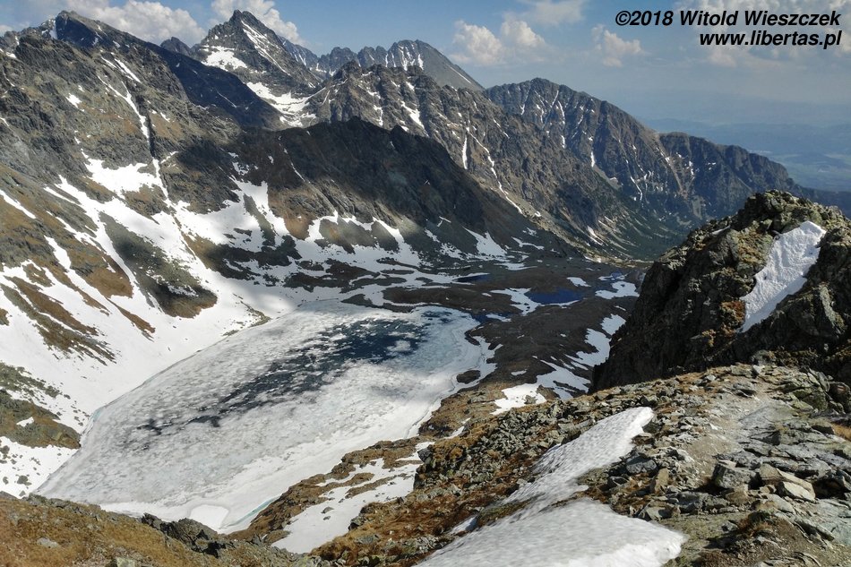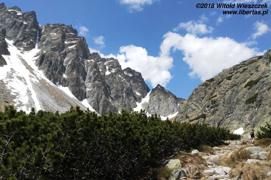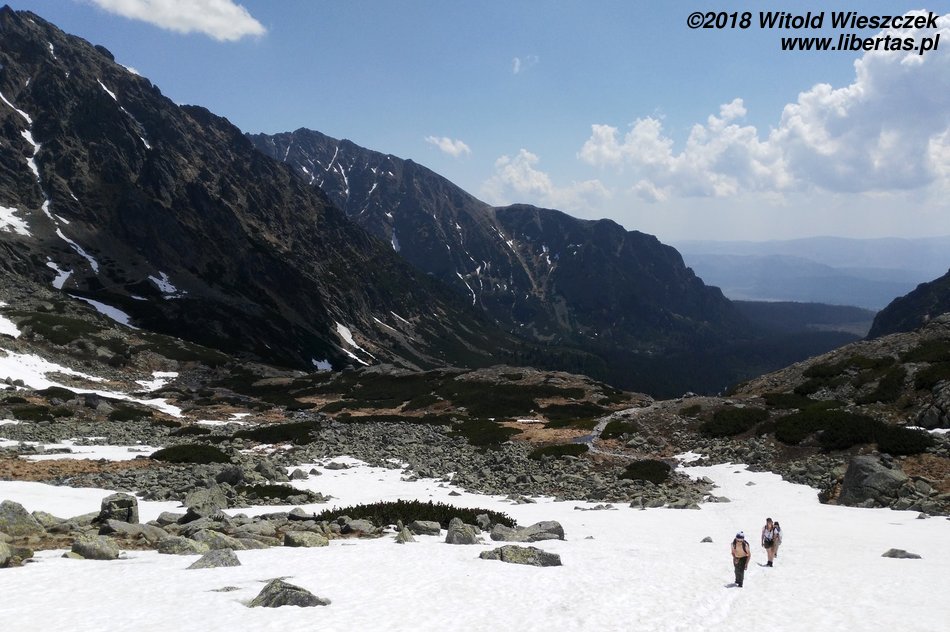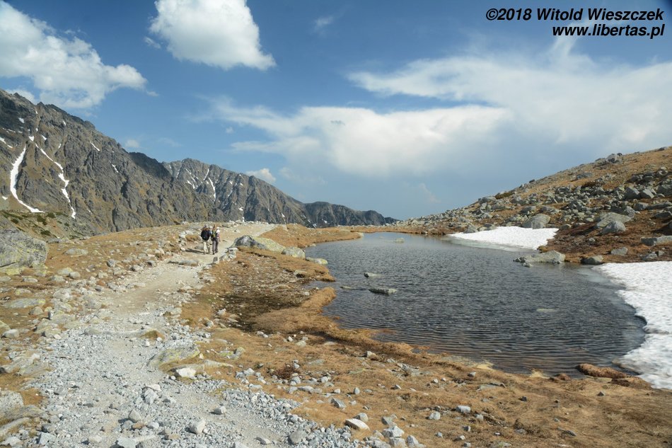 Dochodzimy do Wielkiego Hińczowego Stawu, od tej strony Mięguszowieckie Szczyty wyglądają na jakieś takie mniejsze (za nimi chowa się nasze Morskie Oko). Robi się jeszcze stromiej, ale mimo wszystko dość sprawnie trawersem wdrapujemy się na Wyżnią Koprową Przełęcz.