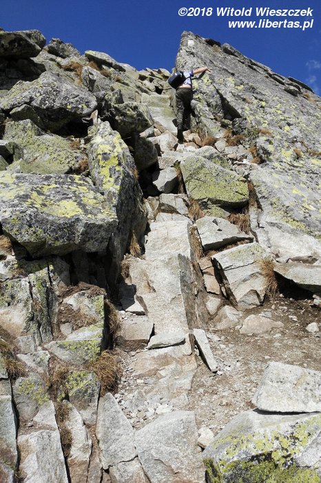Ruszamy ze Szczyrbskiego Jeziora, pogoda znowu nam dopisała, humory też. Śmiejemy się, robimy zdjęcia, opowiadam Jeremiemu o Tatrach, niebezpiecznie ocierając się o granice mojej wiedzy. Jerem ciągle powtarza, żebym coś jeszcze opowiedział, a mnie już się kończą tematy! Gdy doszliśmy do Popradzkiego Stawu, zorientowałem się, że chyba jednak trochę za bardzo spacerowo podeszliśmy do wycieczki i w tym tempie dojdziemy na szczyt dopiero w święta. Chowam aparat i wrzucam piąty bieg. Pomimo że robi się stromiej, idziemy wyraźnie szybciej, a dookoła robi się coraz surowiej i piękniej.
