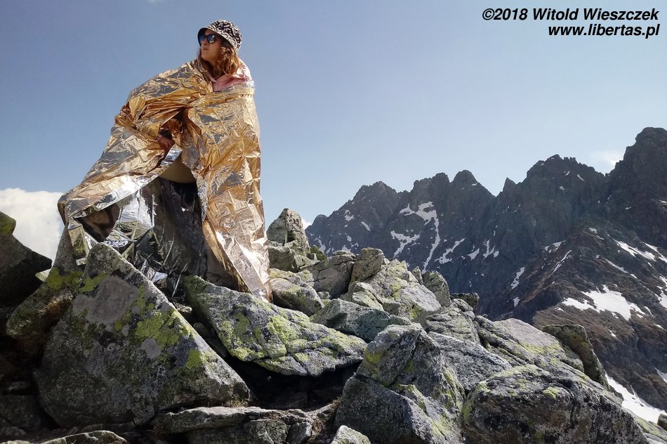 Zmarznięte dziewczęta czekają na przełęczy. Wyśrubowane tempo tak nas grzało, że w zupełności wystarczały nam koszulki z krótkim rękawkiem, tymczasem one opatuliły się we wszystko, co miały, łącznie z folią NRC, a i tak twierdzą, że zamarzają. Wznosimy szybki toast tutejszym piwem, zagryzamy je jakimiś kanapkami i ruszamy w dół, wszak trzeba teraz jeszcze bezpiecznie zejść.