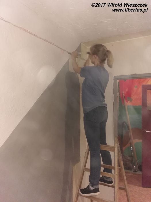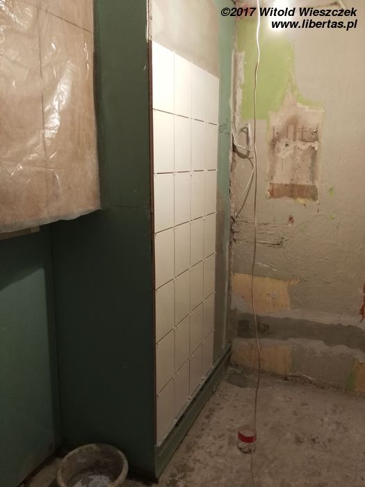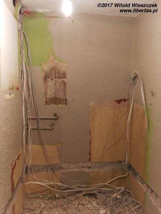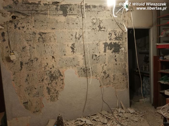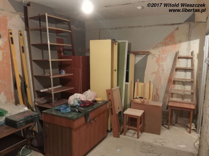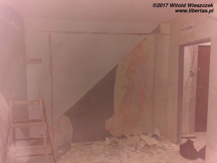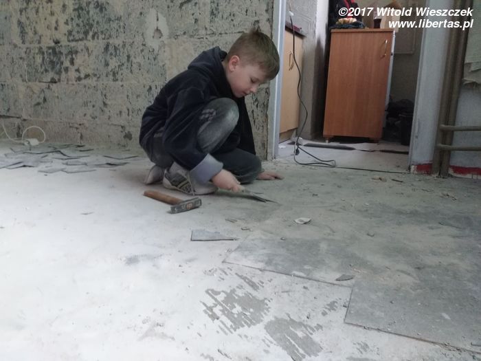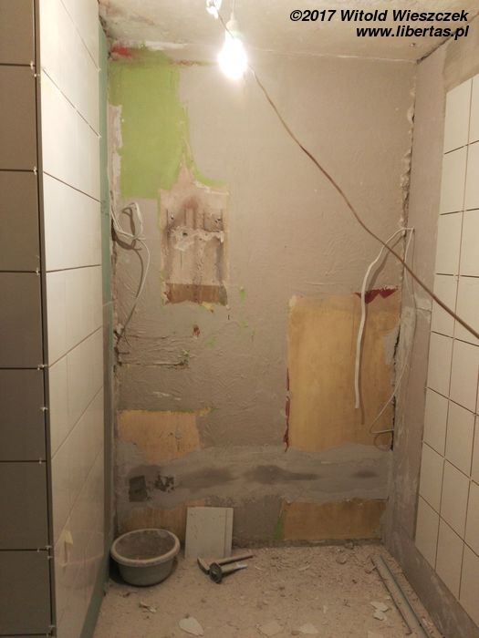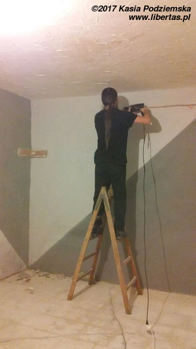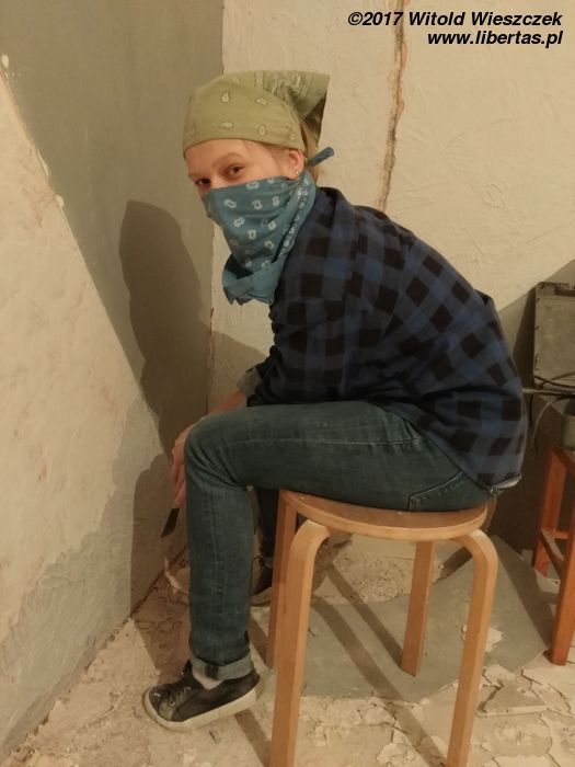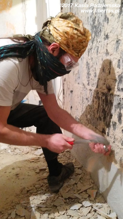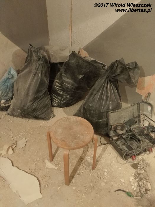 Tymczasem przybywa pomocników i gruzu, przy czym wkrótce okazuje się, że pomocnicy zasadniczo dzielą się na pomocnych i szkodliwych. Bardzo wspiera mnie Grzegorz. Zdjęcia go nie uchwyciły, ale jego pomoc i maszyny zaoszczędziły mi przynajmniej tydzień ciężkiej roboty. Pomagają Kasia i Patrycja, pomaga Jeremi. No ale od początku wydaje się jasne, że pewne rzeczy muszę pozostawić fachowcom. To oni mają położyć płytki w łazience i kuchni. Niestety moi „fachowcy” już pierwszego dnia dają się poznać od jak najgorszej strony, niszcząc zabezpieczone meble („myśleli”, że są do wyrzucenia). Potem jest tylko gorzej. Nie dość, że postępy prac są… niezadowalające, to jeszcze noszą znamiona partaniny. Ściany nie trzymają pionu, podłogi poziomu, a wywiezienie gruzu przerasta ich możliwości logistyczne, więc wyrzucają go na śmietnik. Początkowo się nie przyznają, potem obiecują posprzątać, a ostatecznie kończy się to tym, że 1,5 tony gruzu wywożę razem ze szwagrem. Po miesiącu w końcu wyrzucę „fachowców” na zbity pysk. O miesiąc za późno.