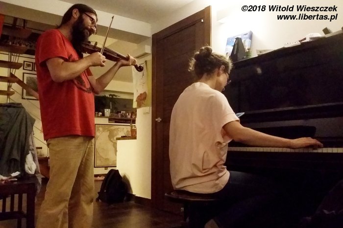 W piątek poza „Masażystą” nie trafiliśmy na żadne interesujące przedstawienie. Atrakcyjność dnia podnosiliśmy spacerami po Krakowie i indyjskim jedzeniem, a wszelki niedosyt topiliśmy w piwie u Jożina. Jerem i Kasia padli, ale powstali i potem bardzo miły wieczór spędziliśmy w towarzystwie Magdy oraz jej futrzaków i instrumentów. Chwilowo córka Magdy prowadzi hotel dla zwierząt, więc dodatkowym domownikiem jest Milka – jak sama nazwa wskazuje – bardzo słodki łaciaty psiak.