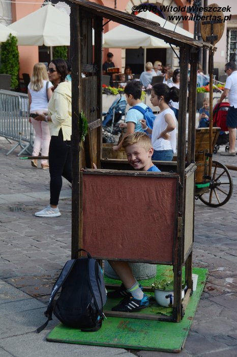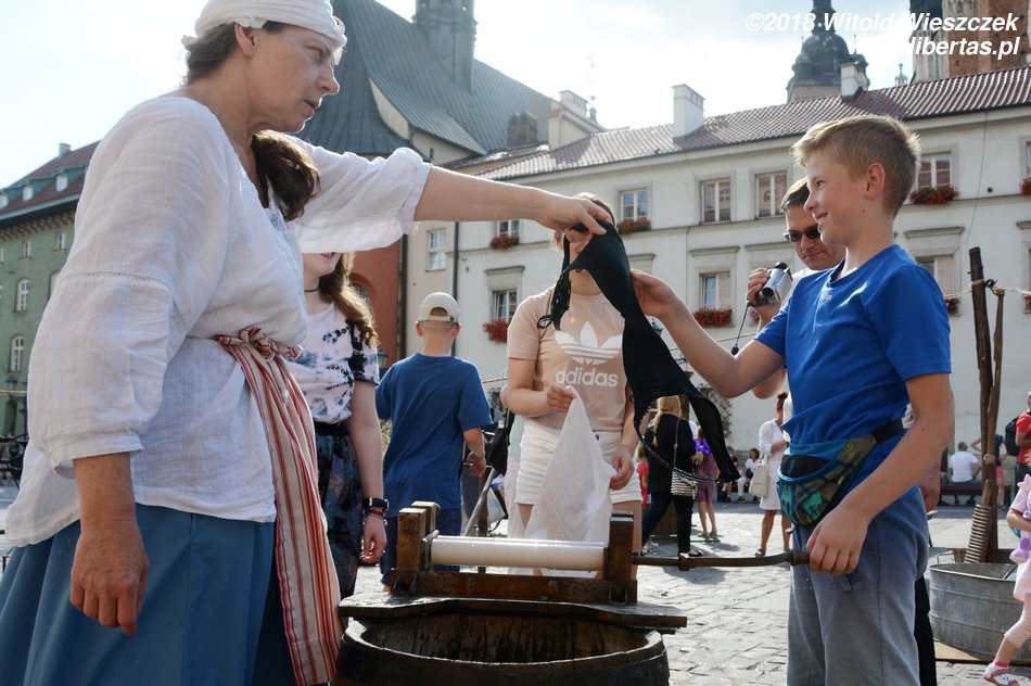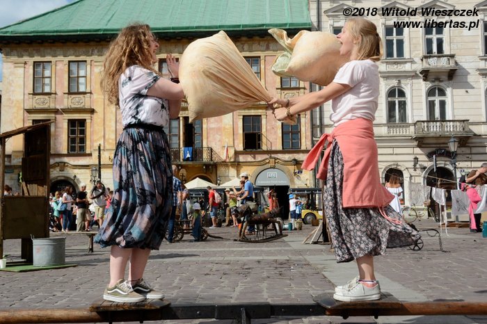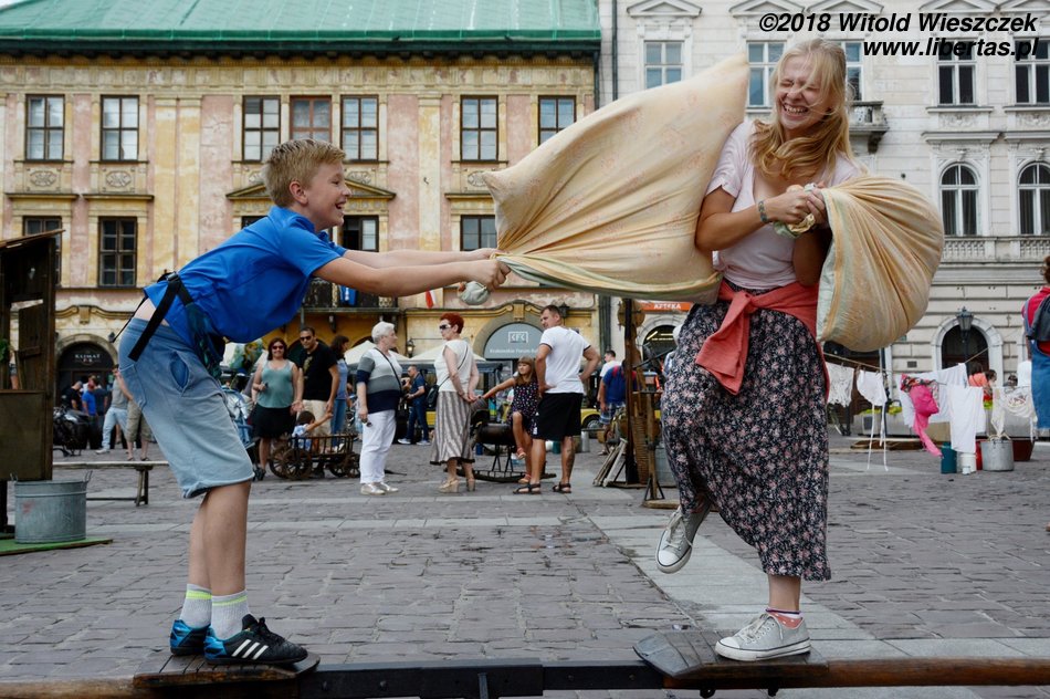 Po południu dołączyła do nas Patrycja, którą zabraliśmy do Starej zagrody. Jak co roku, można się tu pobawić w stylu bardzo retro. Jeremiemu najbardziej spodobało się pranie damskiej bielizny, a dziewczynom sporty walki. Grzmociły się poduszkami, aż pierze rozwiewało się po całym rynku. Dziewczęta walczące w pościeli – ależ to był piękny i podniecający widok!