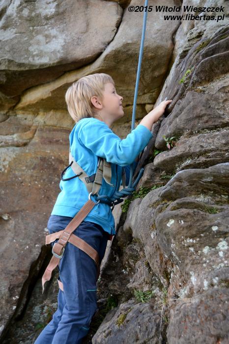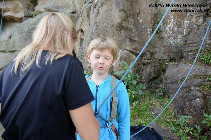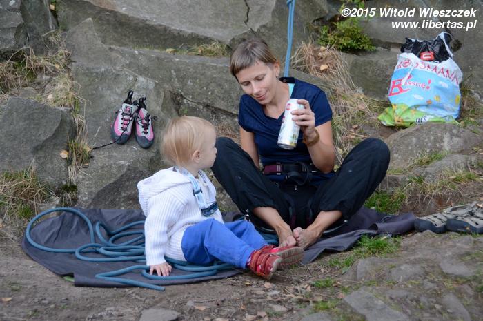Maja, która przecież kiedyś się ze mną wspinała, jakoś się do zabawy nie pali. Woli ćwiczyć niewidzialność. Dobrawa do wspinania się garnie bardzo, ale uprząż jeszcze jest chyba na nią ciut zbyt duża. Może w przyszłym roku. Na razie pije na kocu piwo z ciocią Basią. Jeremi teoretycznie wspinać się chce, ale przewieszone drogi chyba jeszcze są dla niego ciut zbyt trudne. Tę akurat, myślę, miał szansę skończyć, niestety włączył mu się w głowie jakiś dziwny program sabotażysta, bo z niewyjaśnionych powodów nogi zjeżdżały mu nawet z najlepszych stopni.