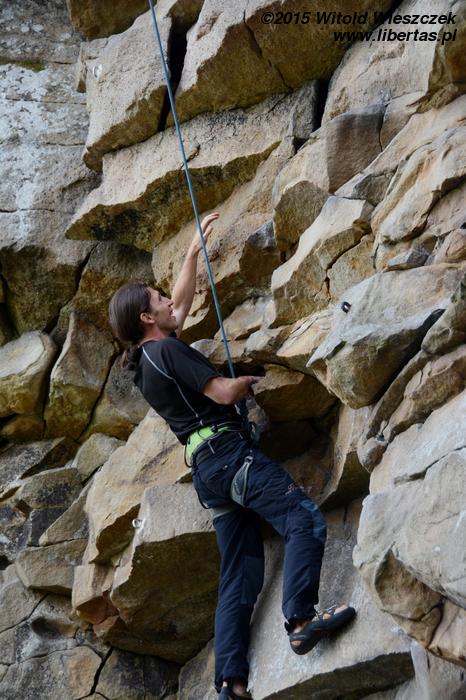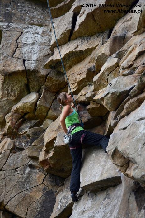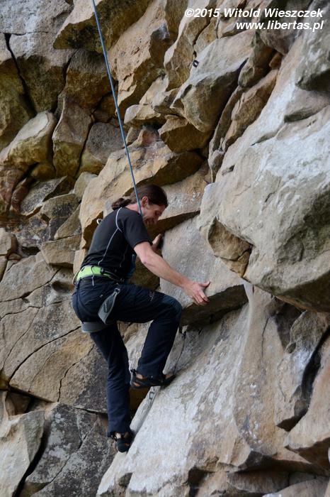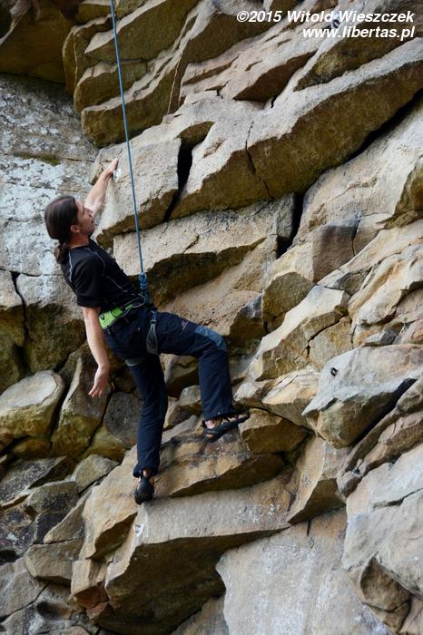 Sierpień zaczęliśmy od czegoś z zupełnie innej beczki, czyli od wspinania w piaskowcu. Basia i Kuba już tu byli, ale dla Kasi i dla mnie było to coś nowego. Już na pierwszy rzut oka widać, że skała inna niż te, do których przyzwyczaiła nas Jura. Nie ma charakterystycznych krawądek, wszystko jest jakieś takie jakby większe. Duże płaskie jak schody stopnie, duże chwyty. Śmiesznie.