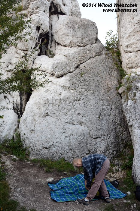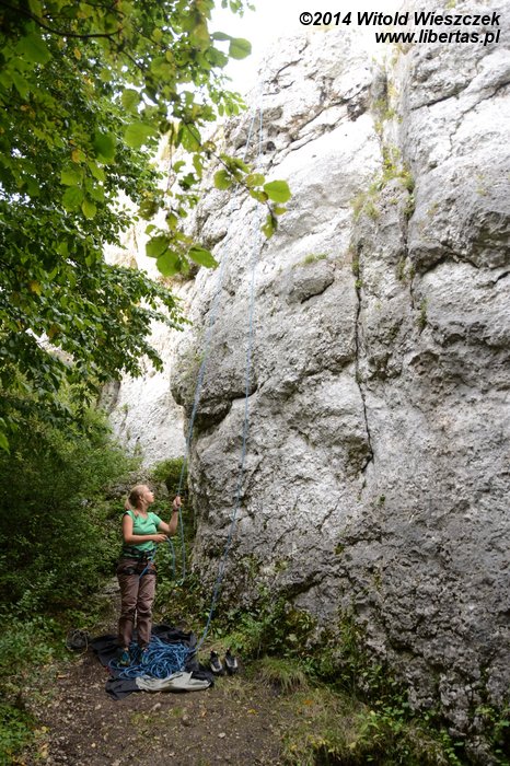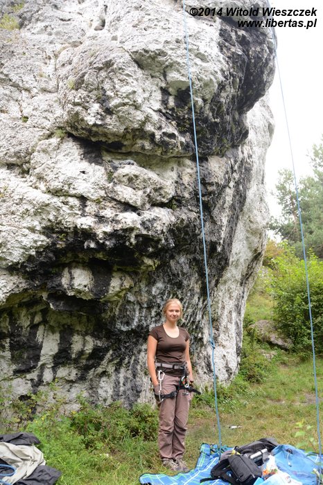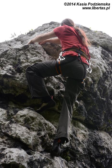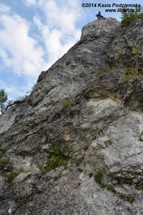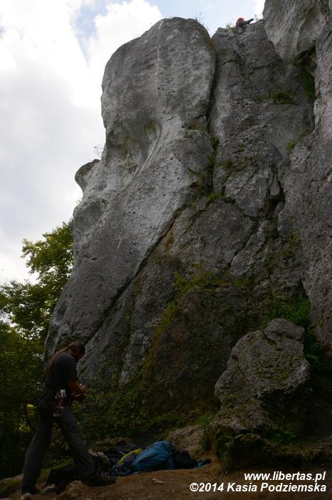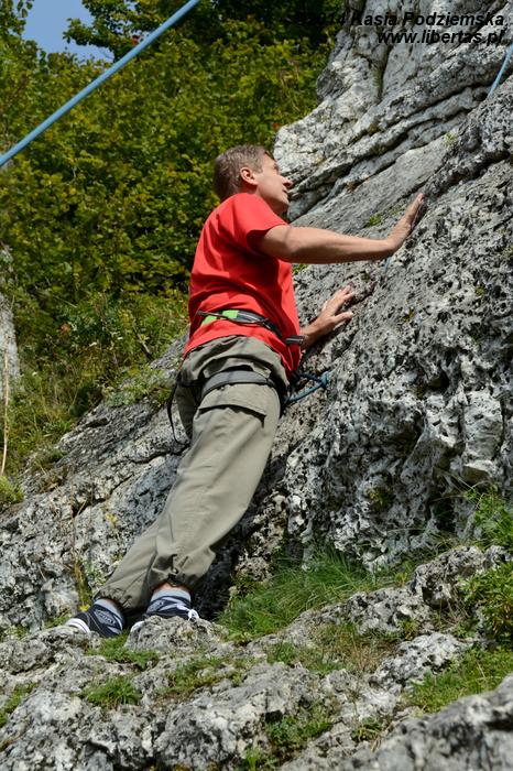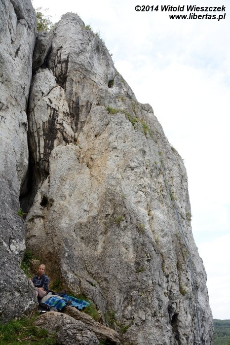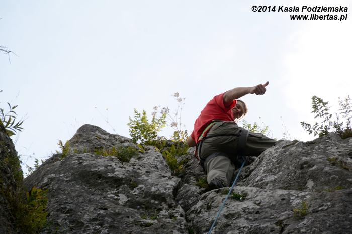 Kasia policzyła, że ostatnio na skałach byliśmy aż cztery tygodnie temu! To chyba najdłuższa nasza przerwa w tym roku! A tu jeszcze jak na złość jestem niepełnosprawny. W przedurlopowym ferworze pracy coś mnie od siedzenia przed komputerem pogięło. Boli szyja, drętwieje ręka. Czy ja w ogóle dam radę się wspinać? Tak! Okazuje się, że nie tylko mogę, ale wręcz są to jedyne chwile, kiedy mnie nie boli! Nie wiem, czy to kwestia adrenaliny, czy ułożenia ciała, ale podczas wspinania czuję się świetnie. Boli tylko, gdy zadzieram głowę do góry podczas asekuracji Kasi. Więc już nie zadzieram. Na wszelki wypadek postanawiamy się oszczędzać i robić tylko łatwe drogi. Niestety ludzi trochę jest i ostatecznie rozgrzewamy się, starając się przejść na wędkę... VI.2. Nie ma to jak łatwa droga na rozgrzewkę dla kontuzjowanego tetryka.