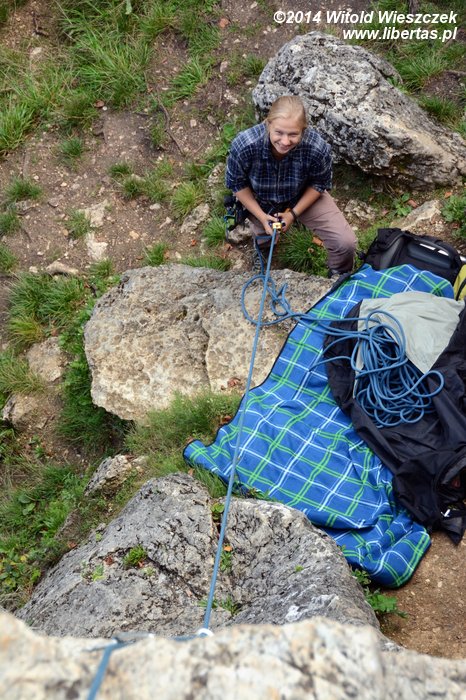 Prowadzimy natomiast bardzo sympatyczną, częściowo na własnej asekuracji, dość długą Żółtą Ściankę. Ma tu miejsce historyczny moment, czyli pierwsze użycie naszego heksa. Nie będę pokazywał palcami, ale byli tacy, co drwili, że tylko jeden, że duży i w ogóle nie ma nic śmieszniejszego niż wspinacz z jednym heksem! I co? No i się przydał! I jak pięknie siedział! Kasi pozostaje teraz wszystkie te kalumnie odwołać!
