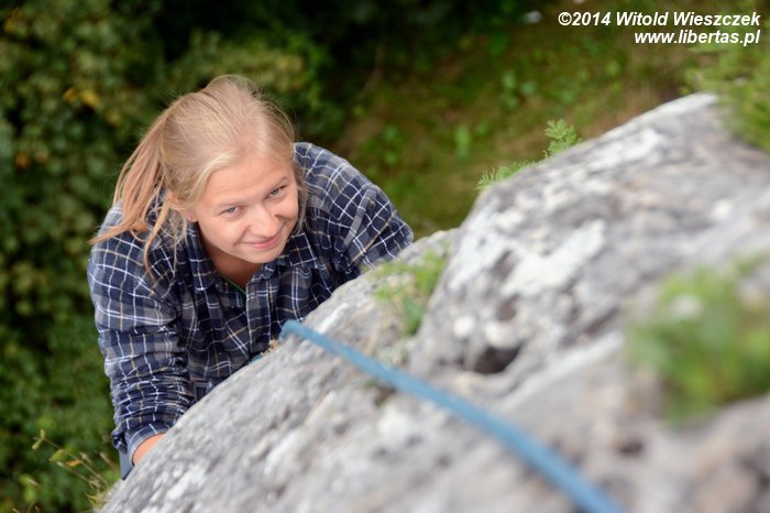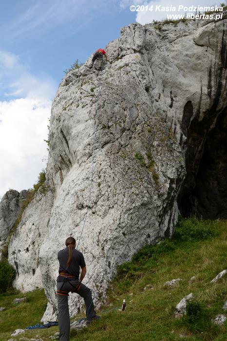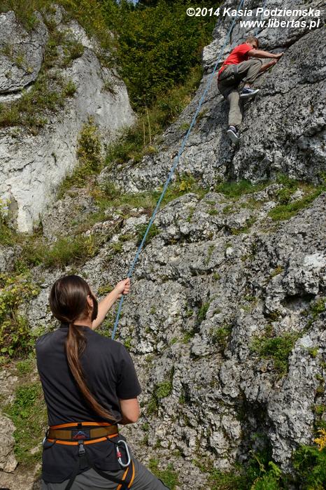 Ta wspinaczka to jednak jest bardzo zaraźliwa. Tata Kasi tyle się nasłuchał o przygodach swojej córki, że w końcu nie wytrzymał i powiedział, że też chce! Przywiązał się ósemką do drugiego końca liny i poszedł, aż się kurzyło. Na początek od razu ambitnie zabrał się za piątkę na Zadniej Turni. Szło świetnie i tylko końcówki nie udało się pokonać, ale w zwykłych trampkach rzeczywiście nie jest to łatwe. Później walczył na trójce na turni Kursantów, ale tam ostatni moment również w zwykłych butach wymaga już trochę więcej wprawy. W międzyczasie Kasia patentuje sobie Sąsiadów, przygotowując się do RP. Na deser Michał zalicza już dwa w pełni udane wejścia na sam szczyt: trójkową drogę na Garażu oraz czwórkową na Leśnej. Gratulujemy!