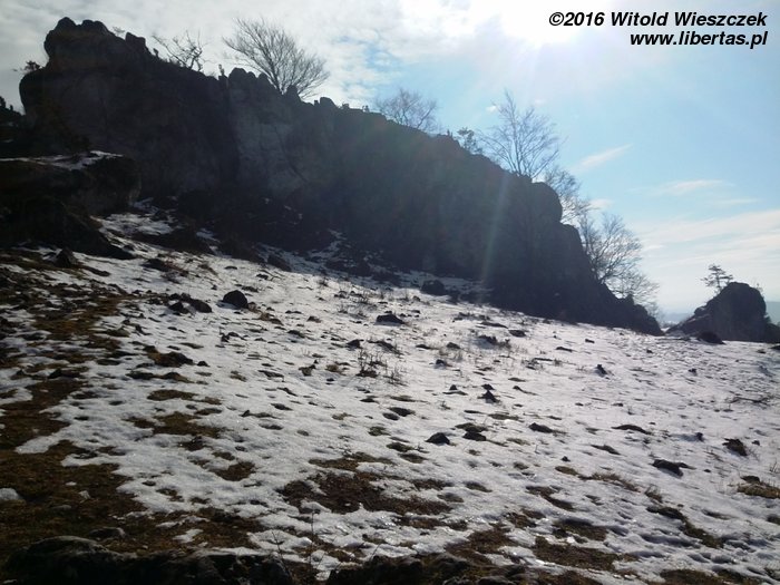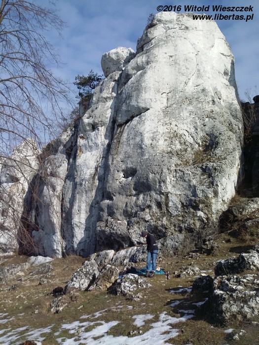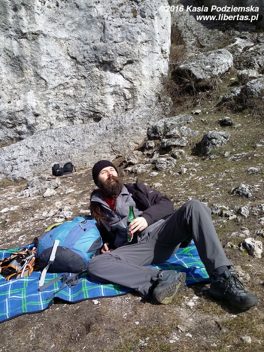 Sezon rozkręca się powoli. Nastawiamy się wprawdzie na niskie temperatury, ale w mieście śniegu nie ma, więc biel na mocno nasłonecznionej polanie trochę nas zaskakuje. Na szczęście słoneczka jest jednak więcej z każdym dniem i wspinanie jest coraz przyjemniejsze. Zresztą po grudniowo-styczniowych wyjazdach jesteśmy zaprawieni. Pewnego pięknego, słonecznego, marcowego już dnia, grupa wspinaczy przechodzi obok nas i dotykając skały, kręci nosem, że trochę mokra. My na tę samą skałę patrzymy z zadowoleniem, bo nie ma ani śladu lodu, a Kasia jest przeszczęśliwa, bo w połowie drogi czuje jeszcze palce!