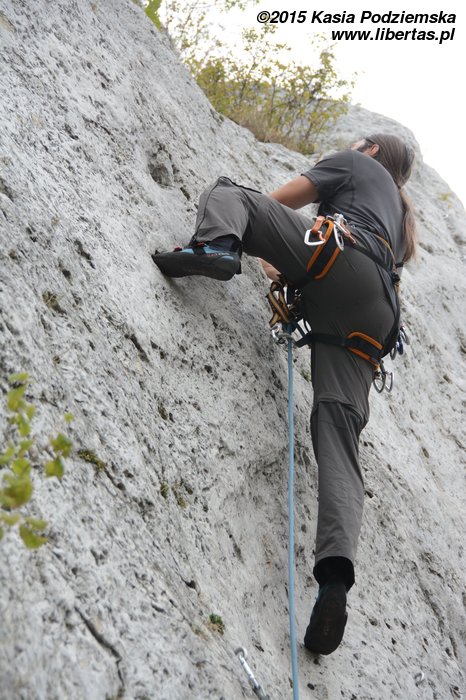 W sobotę szukamy szczęścia w Rzędkach. Patrycja uczy się asekurować i zalicza swoje pierwsze prowadzenie drogi. Dzielna dziewczyna! Anschluss (IV+) RP – gratulujemy!