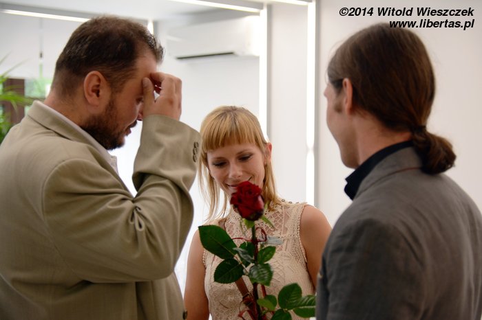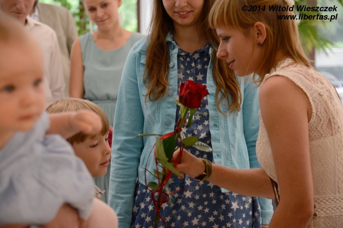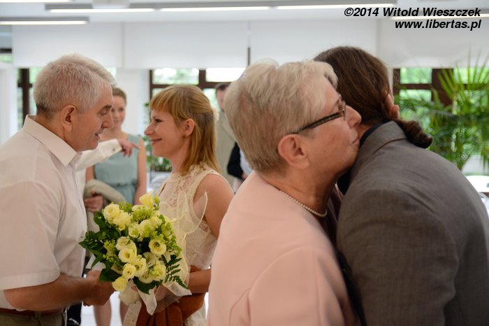 W tym momencie wszyscy spieszyli złożyć Młodej Parze życzenia na nowej drodze życia. Tylko Jeremi trochę się ociągał, zapewne bojąc konieczności całowania, co jak powszechnie wiadomo jest czynnością niehigieniczną i obrzydliwą. Na szczęście Basia wykazała się empatią i przewidując, że młodzieńcy w tym wieku jeszcze uroków całowania nie doceniają, oszczędziła mu tego przykrego obowiązku, przyjmując zamiast całusa różę.