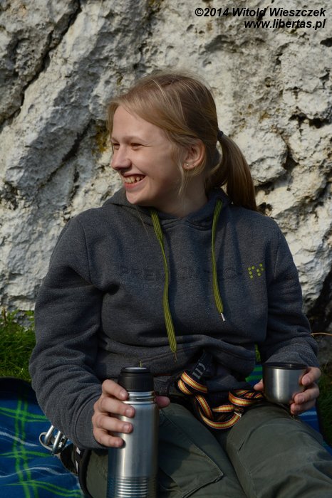 Udało się, choć nie czysto, więc drogi zaliczyć sobie nie mogę, ale już wiem, że jest w moim zasięgu. Następnym razem będzie moja! Kasia też jest zadowolona, bo po raz pierwszy udaje jej się zrobić tę drogę na wędkę. Słoneczko nam przyświeca, a my dumni z sukcesów pijemy zwyczajową herbatkę o piątej. W końcu wiadomo, siła spokoju.