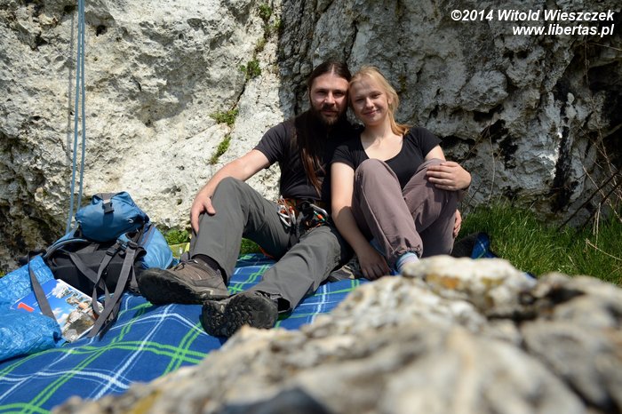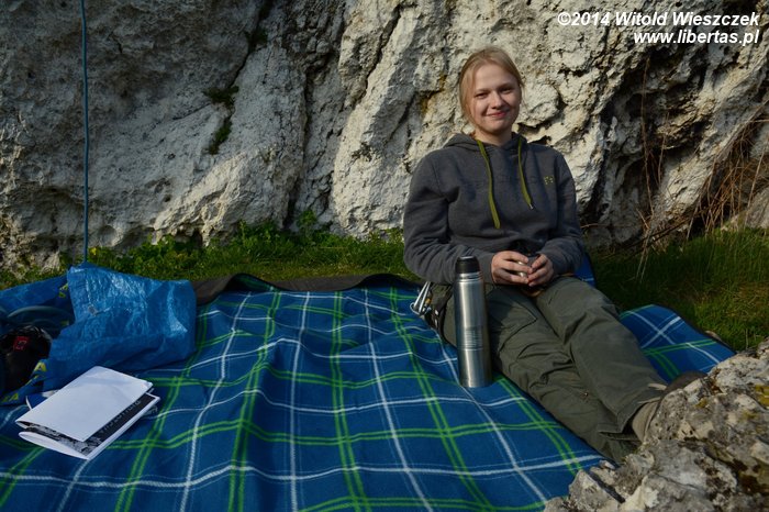 Trochę zmęczeni wieszamy wędkę na Ufokach, które też wypadałoby w końcu poprowadzić, bo trochę wstyd. Obok jednak są dwa kursy, więc postanawiamy poszukać miejsca trochę spokojniejszego. Idziemy na Faszystowski, gdzie Kasia po raz kolejny patentuje sobie No Pasaran. Idzie jej całkiem nieźle, więc myślę, że to będzie nasze kolejne klubowe RP. Zasłużyliśmy na odpoczynek. Rozkładamy kocyk, podziwiamy okoliczności przyrody i oddychając pełną piersią po prostu tracimy czas...