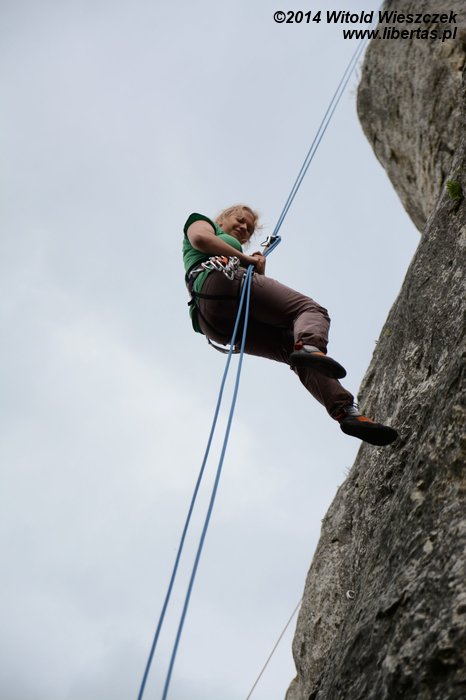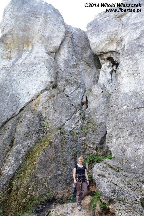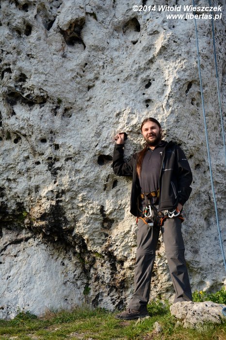 Największe wrażenia jednak dopiero przed nami. Na Aptece rozgrzewamy się na przyjemnej czwórce plus, a następnie poprawiamy zepsuty ostatnio Filar Apteki (IV+) RP i dalej patentujemy zdecydowanie za trudną dla nas Ściankę Aptekarzy VI. Potem na Kaskadzie robimy Drogę kursową (IV+) OS, aż w końcu docieramy do Ściany z dolnym Ogródkiem, gdzie przewidzieliśmy gwóźdź programu, drogę o fantazyjnej nazwie: Cześć i dziękuję za ryby (IV+) – naszą pierwszą dwuwyciągówkę! Zabawa okazuje się bardziej skomplikowana, niż nam się wydawało, zajmuje ponad godzinę, a droga staje się ostatecznie trzywyciągówką z zupełnie innym przebiegiem! Innymi słowy – trochę się pogubiliśmy, ale nie narzekamy, bo cała przygoda kończy się spektakularnym, prawie 30-metrowym zjazdem przez przewieszkę! Niestety zaczyna padać deszcz i w pośpiechu zapominamy zupełnie o zdjęciach, a przecież chwila to była historyczna! O zaniechaniu przypominamy sobie dopiero w drodze powrotnej do samochodu. Tak więc wygląda nasz KW jakieś 20 minut po pierwszych ekscytujących przygodach z wielowyciągówką. Może żadnej górskiej nagrody za to nie dostaniemy, ale co tam, i tak było... fajnie.