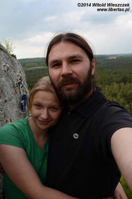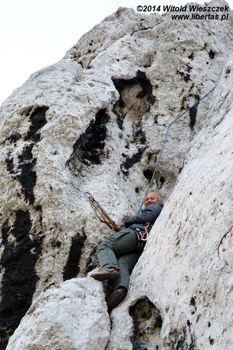 Dzień rozpoczął się wyśmienicie, więc pomyślałem, że dobrze by było dorzucić do tego sukcesu Kasi jakiś mój. Poszliśmy zatem po raz kolejny na Sąsiadów i... Niestety porażka i zawód. Tym razem zamiast świętowania Kasia musiała mnie pocieszać! To już chyba moja trzecia próba czystego poprowadzenia tej drogi i za każdym razem przed drugim przelotem coś sknocę. Fatalnie! Powtarzam to potem jeszcze raz na wędkę i wcale nie wychodzi lepiej. Za to Kasia ewidentnie ma dobry dzień i na wędkę robi tę drogę znacznie swobodniej niż ostatnio. Jak tak dalej pójdzie, to poprowadzi ją czysto jeszcze przede mną!
