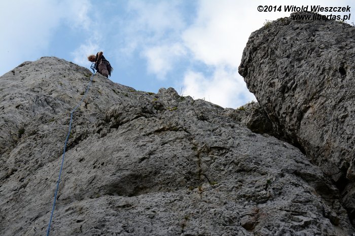 Kursanci zajmują drogę, którą chcieliśmy zrobić, więc żeby bezczynnie nie czekać, robimy tradem Słoneczny Filar (III) i wieszamy wędkę na Drink Barze. Kiedyś próbowałem to prowadzić i utknąłem w połowie, więc może to dobra okazja, żeby próbować drogę patentować. A może nie? Kasia idzie pierwsza i dzielnie walcząc, przechodzi drogę na wędkę. Mnie w trakcie łapie deszcz. Nie ma czasu na patenty, trzeba się tylko jakoś tam wczołgać, żeby odzyskać sprzęt i uciekać!