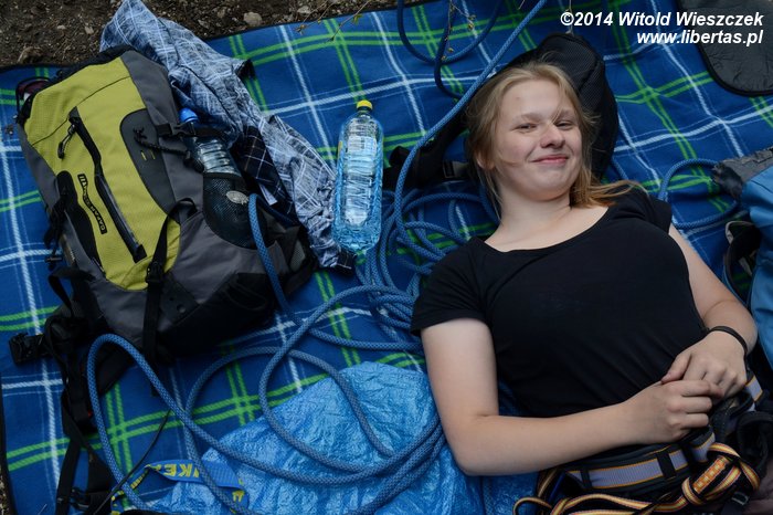 Cóż, była to bardzo cenna i całe szczęście darmowa lekcja. Nigdy więcej tradowego wspinania po deszczu na porośniętych mchem i ubłoconych ścianach! To była najbardziej ekstremalna trójka w naszej karierze, którą na długo popamiętamy. Kasia była tak roztrzęsiona, że aż jej się same guziczki rozpinały! Na dzisiaj może wystarczy.