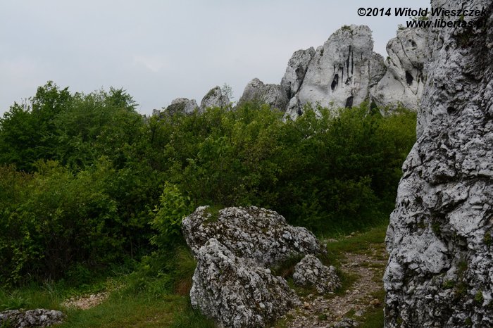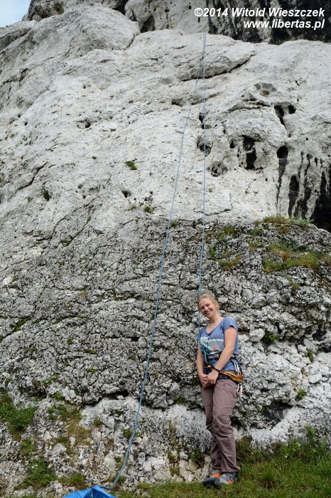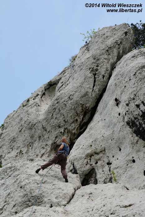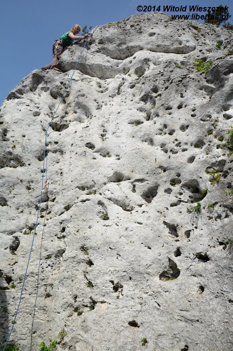 Tam spodziewaliśmy się nieco więcej spokoju, więc z zaskoczeniem przyjęliśmy głosy dobiegające od skał jeszcze zanim pod nimi stanęliśmy. Większość dróg była zajęta i trzeba było czekać. Na rozgrzewkę dwie IV+, a potem patentowanie Ścianki Aptekarzy (VI). Kasi udało się znaleźć nowy sposób na największą trudność, więc kto wie, może następnym razem w końcu uda nam się przynajmniej zrobić to w ciągu.