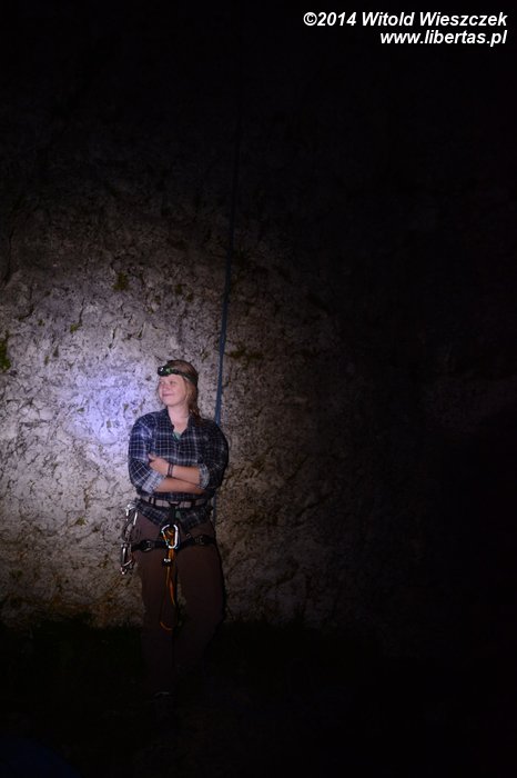Nawet nie wiemy, kiedy zaczyna za drzewami zachodzić słońce. Postanawiamy się ewakuować, żeby przypadkiem znowu po ciemku nie pobłądzić, no ale przecież nie zrobiliśmy jeszcze dzisiaj żadnej drogi na własnej! Tak być nie może. Zapada już zmrok, ale mamy przecież czołówki. Na deser robimy więc jeszcze trójeczkę w sposób tradycyjny i zdjęcie już przy świetle czołówki. Zresztą, skoro niewidomi się wspinają, to dlaczego nie my?