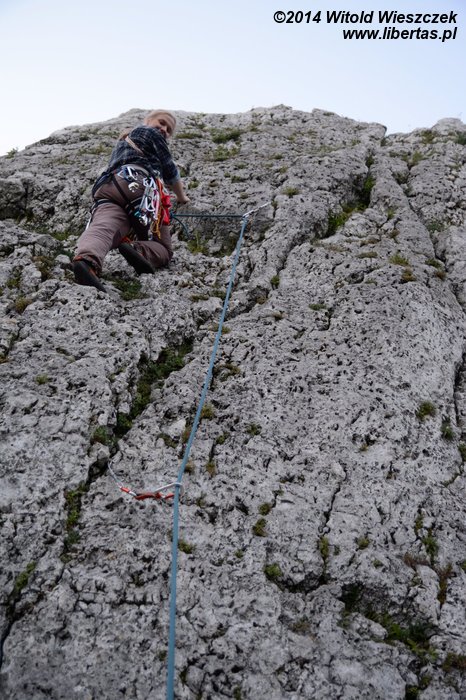 Niestety, tam gdzie zaczynała się upatrzona przez nas trójka, było bajoro błota! Trochę szkoda byłoby liny, że nie wspomnę o wizji Kasi ślizgającej się w błocie i próbującej mnie asekurować. Wymyśliliśmy, że dojdziemy do właściwej drogi trawersem. Już pierwsze dwa metry okazały się bardzo wymagające. Skała była porośnięta mchem i zalana błotem, no ale wrócić nie było już jak. Założyłem pierwszą kość i zacząłem trawersować. Po dwóch krokach miałem dość. Żadnych solidnych chwytów, które dawałyby pewność, że nie polecę, a pod nogami lodowisko. Na domiar złego po czterech kolejnych metrach wciąż nie było okazji, żeby coś założyć. W końcu się udaje, ale zaufanie do tego średnie, a dalej wcale nie lepiej. Marzę już tylko o tym, żeby dość do jakiegokolwiek ringu z innej drogi, a potem bezpiecznie wdrapać się na górę.