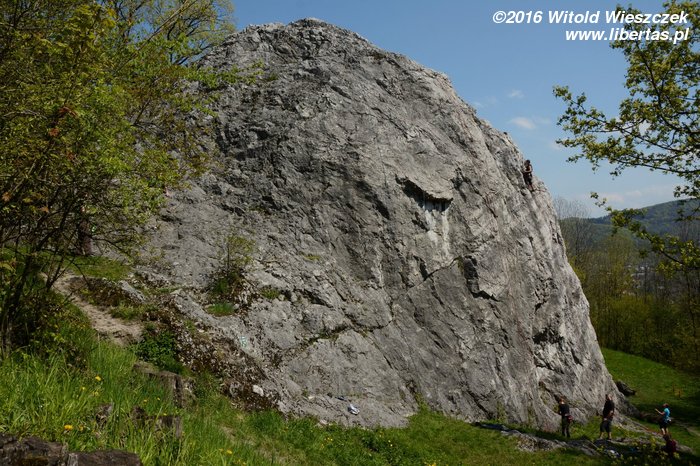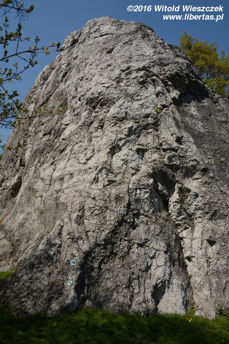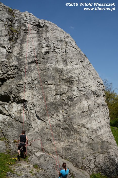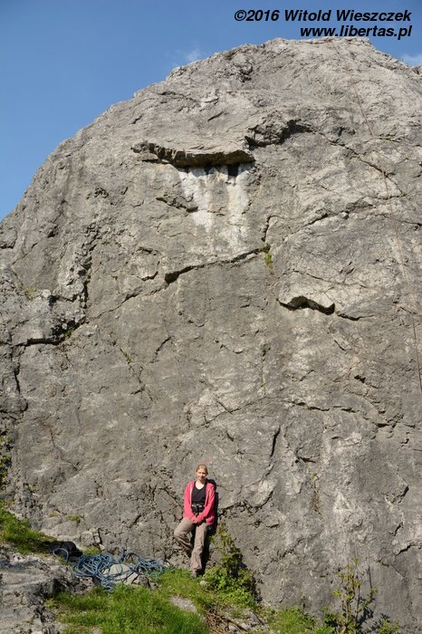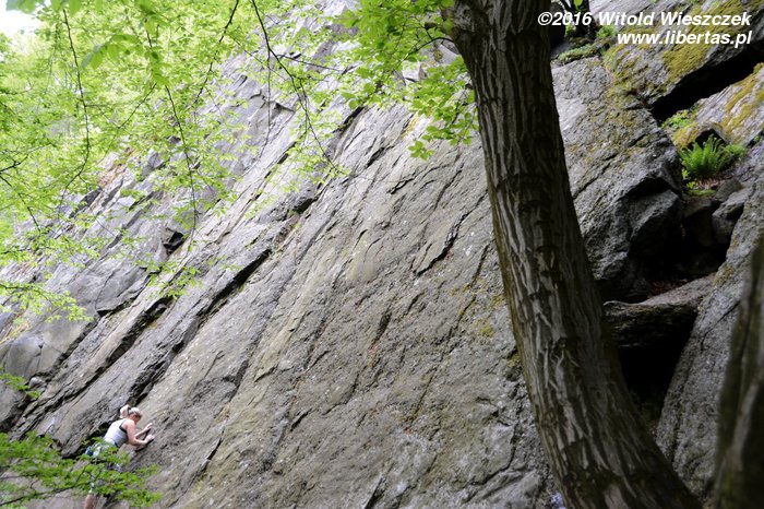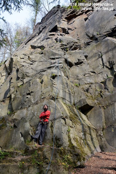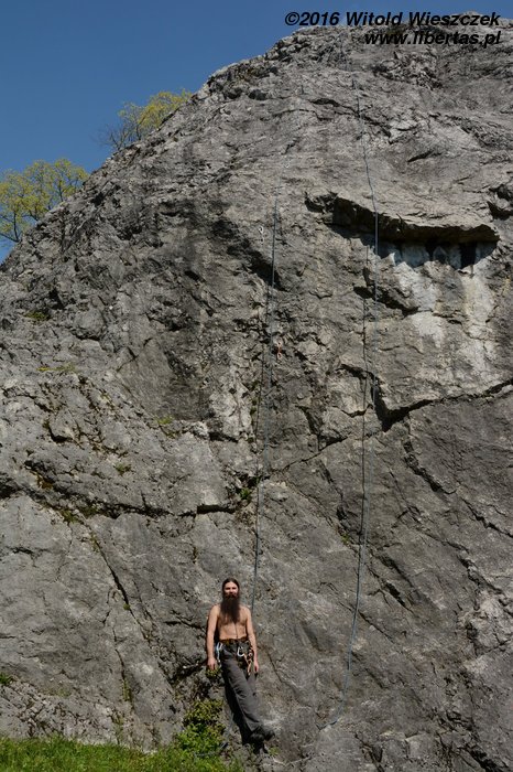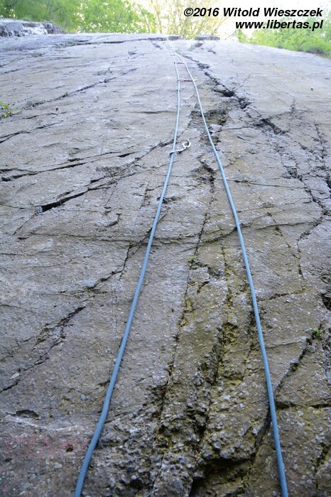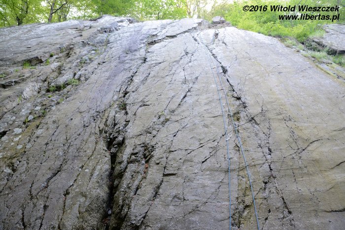 Tym razem nawet już nie sugeruję, żeby Kasia prowadziła. Wstawiam się i robię drogę czysto, ale nie powiem, żebym czuł się na niej komfortowo. Do trzeciego przelotu ze dwa razy omal się nie zanieczyściłem – jak to barwnie ujął pan Sapkowski. Gdybyśmy robili te drogi w kolejności od najniżej wycenianej, to chyba nie wpadłbym na pomysł, żeby prowadzić tę pierwszą szóstkę! Czwórka w zasadzie jest czwórką, więc niby nie jest trudna... Ale wpinka jest wysoko, a potem jest jeden dość nieprzyjemny moment. Chyba nie polecam. Převisek (IV/IV+) OS.