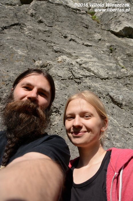Morituri te salutant! Zrzucam linę i czysto robię swoją pierwszą czeską szóstkę! Podglądałem Kasię, więc zamiast oesa: Tururu (VI-) błysk. Kasia nie daje się namówić na prowadzenie, ale na wędkę robi bez problemu, więc oczywiście to nie kwestia braku umiejętności. Droga jest naprawdę fajna, nietrudna i jak na warunki czeskie wręcz komfortowo obita. Polecam!