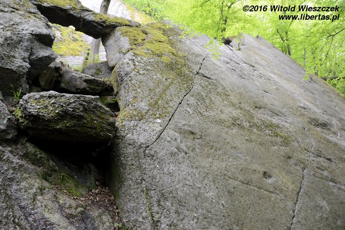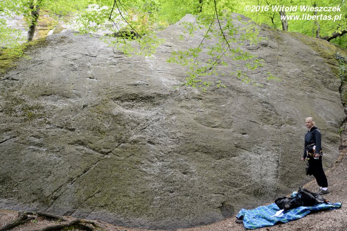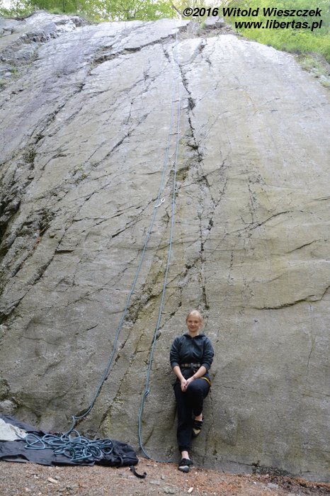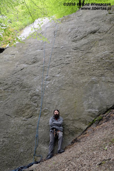 Kilka słów o skałach. Pierwsze moje skojarzenie: „po jaką cholerę ktoś tu wylewał taką betonową płytę”! Geologiem już nie zostanę. To oczywiście zlepieniec, ale mówcie sobie, co chcecie, wygląda jak przewrócona stara betonowa płyta. Czyli dzisiaj będziemy mieć chrzest bojowy na rajbungach! Kiedy czytałem o tutejszych połogach, wydawało mi się, że będzie to łatwe wspinanie w sam raz dla nas, dlatego bez skrupułów wysyłam po OS-a Kasię. Marudzi strasznie, ale nie odpuszczam i groźbami oraz prośbami zmuszam – żeby nie powiedzieć – terroryzuję(!), do dalszej walki. Bezejmenna (III) OS. Zrzucam linę i robię drogę błyskiem, ale oddaję Kasi sprawiedliwość, nie jest to wcale takie proste!