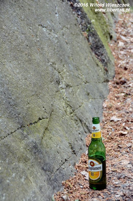 Trafiamy pod pierwszą skałę i otwieramy Stare Źródełko. No, takie trunki to ja rozumiem. Niby koncerniak, a jednak Tyskie na tej samej półce stać nie może. W sklepie zaopatrzyłem się w kilka wersji Staropramena, a z ciekawości uzupełniłem Zlatopramenem. Nie samym horolazactwem człowiek żyje. Trzeba i o kulturalną degustacyję zadbać. Degustujemy pod wysoką na 20 metrów Bezimienną (Bezejmenna).